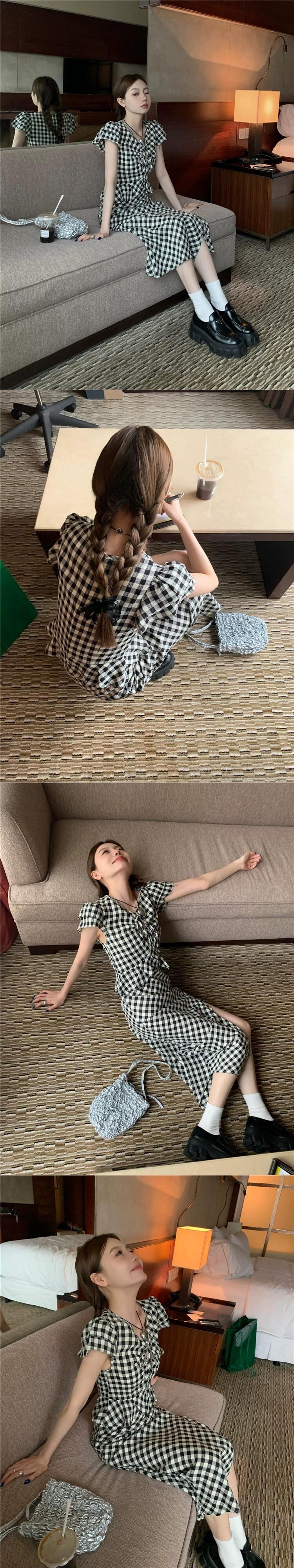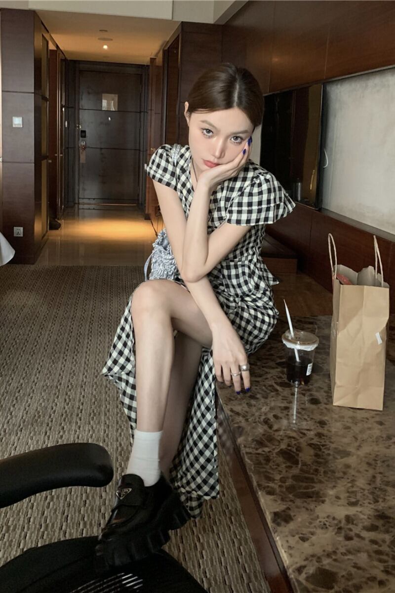 レトロチェック柄中空デザインドレス婦人服夏 2023 新スタイル蓮の葉エッジウエスト痩身スリットスカート サマー 夏物 0921928307025967