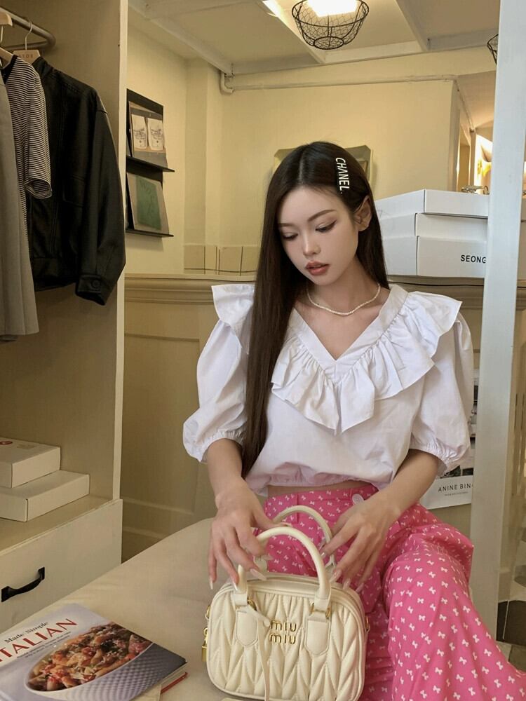 フランスの気質 V ネックフリル半袖シャツ女性の 2023 夏の新しい甘いパフスリーブショートシャツ 大人ガーリー スウィート キュート カジュアル サマー 夏物 Vネック 0921960110618201