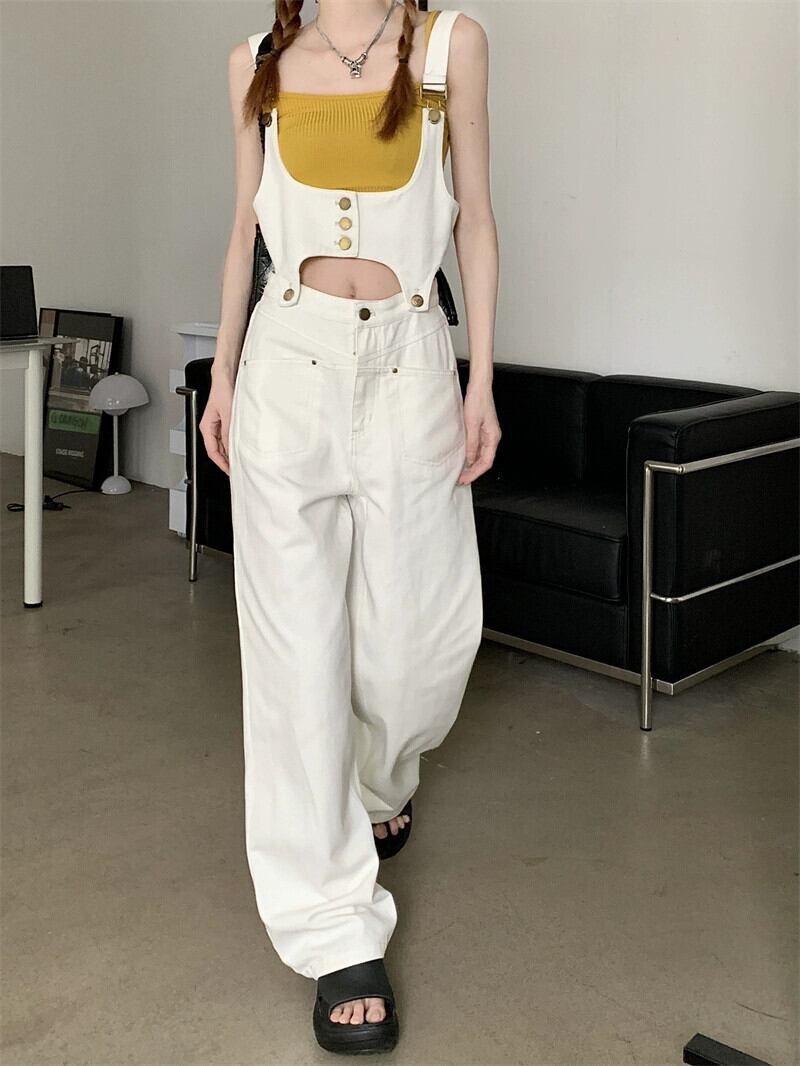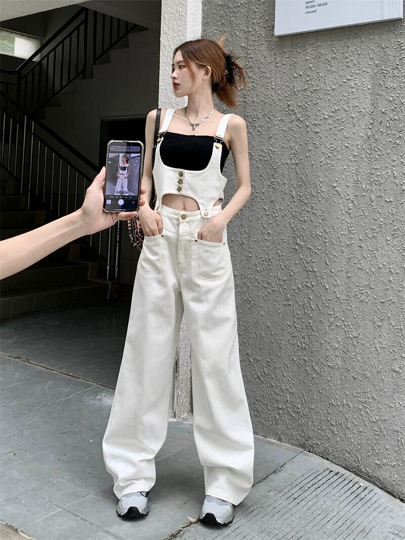 スパイススタイルホワイトデニムオーバーオール婦人服2023年夏新作ルーズオールマッチ年齢軽減パンツワイドレッグパンツ サマー 夏物 092198806634684