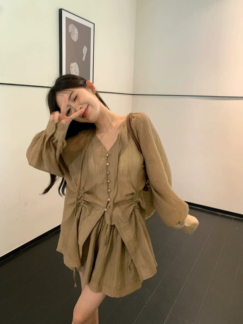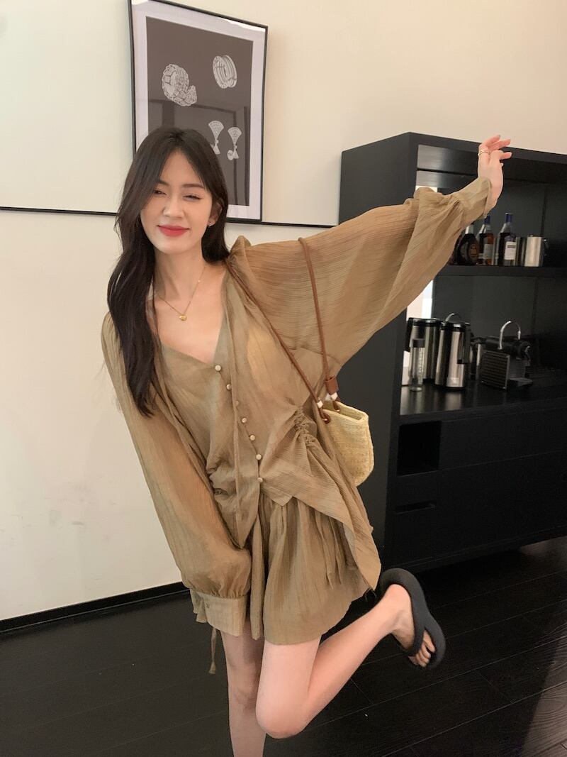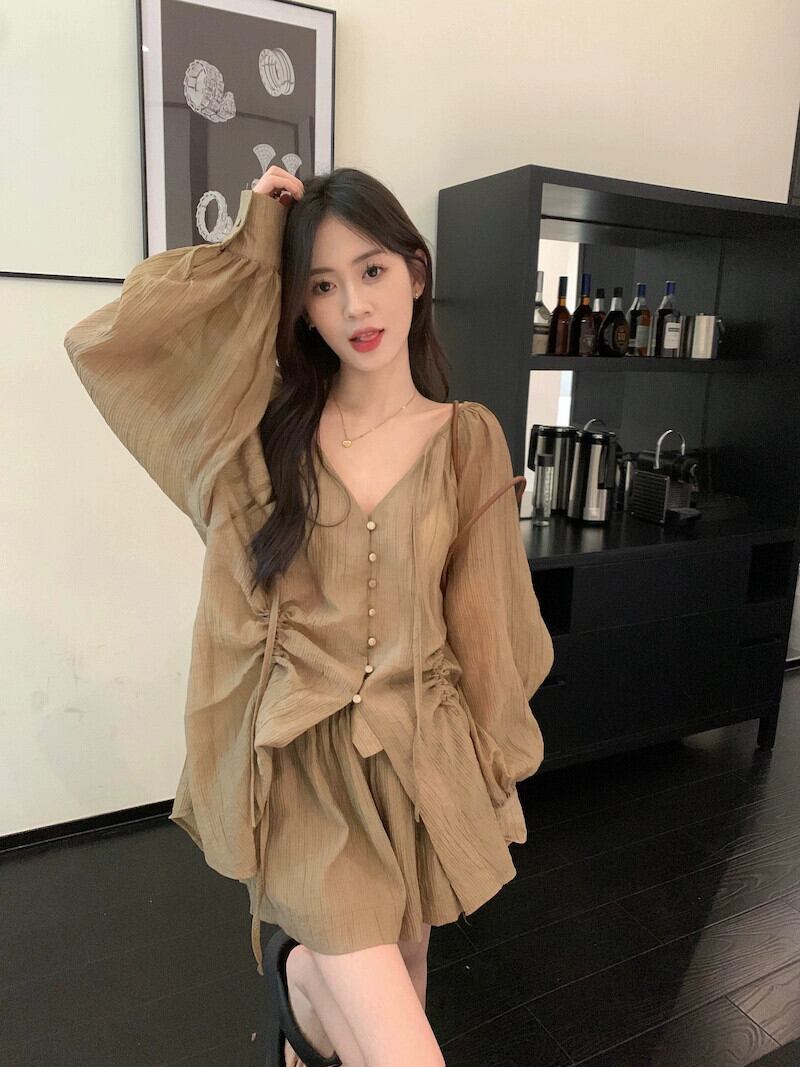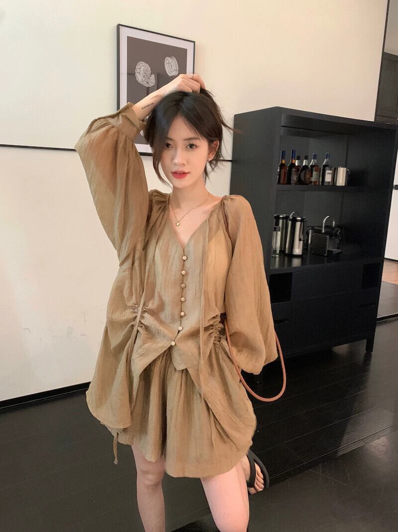 フレンチ V ネック薄地プリーツ長袖日焼け止めシャツレディースサマースーツハイウエスト薄手ワイドレッグショーツ 2 点セット ハイウェスト ロング 夏物 ブルマー Vネック 0921936515205573