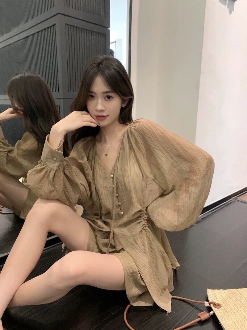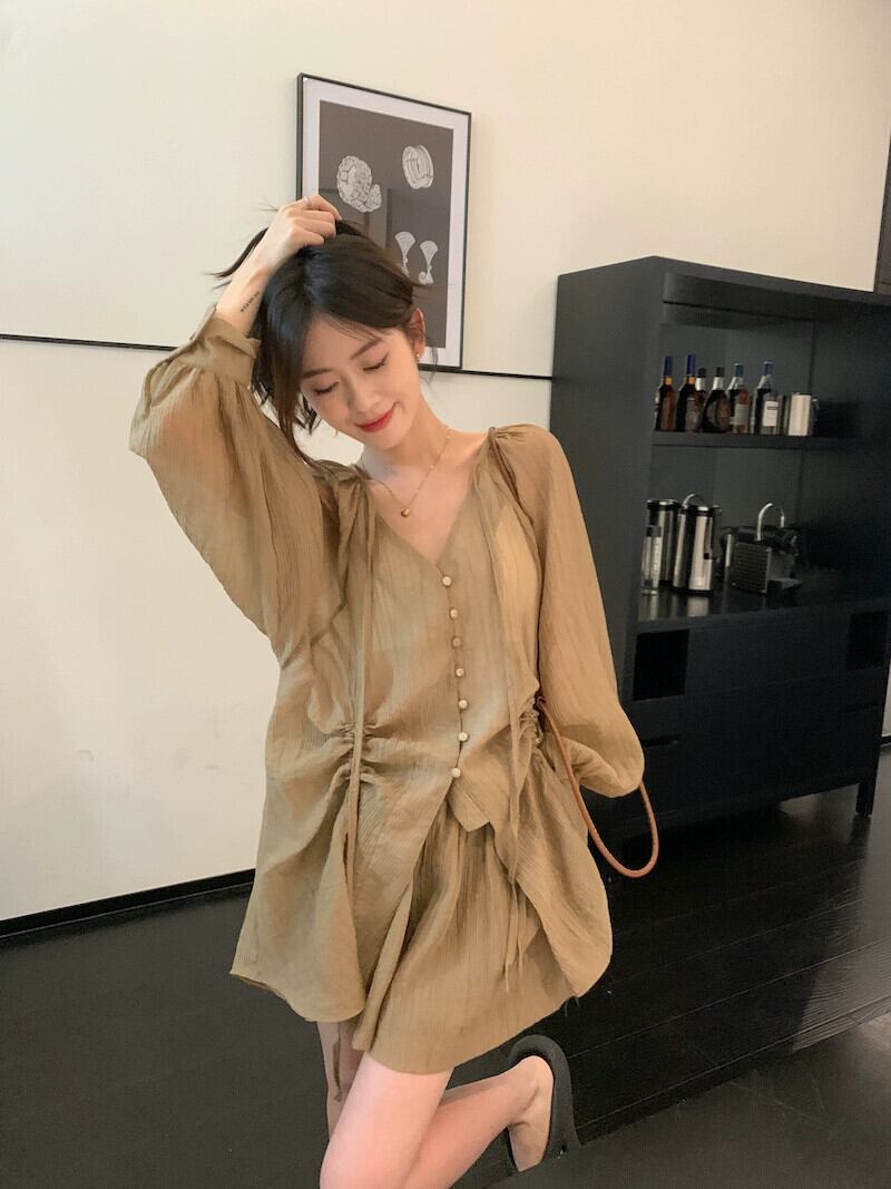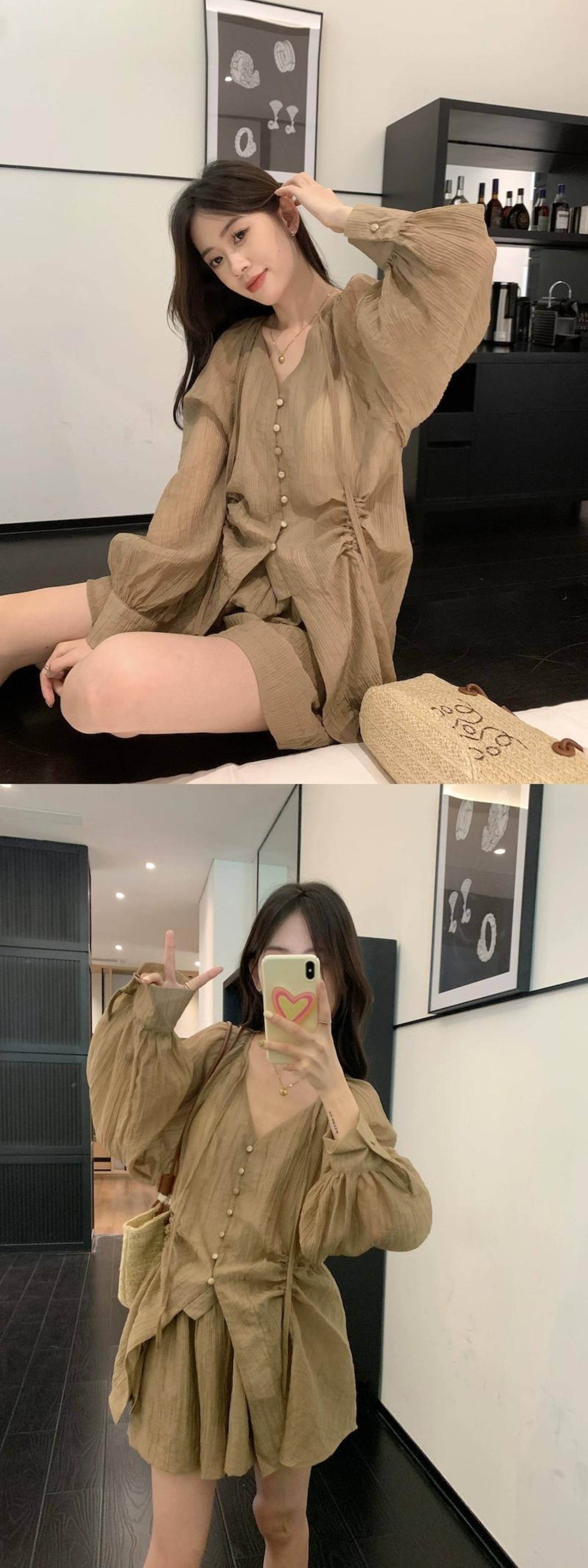 フレンチ V ネック薄地プリーツ長袖日焼け止めシャツレディースサマースーツハイウエスト薄手ワイドレッグショーツ 2 点セット ハイウェスト ロング 夏物 ブルマー Vネック 0921936515205573