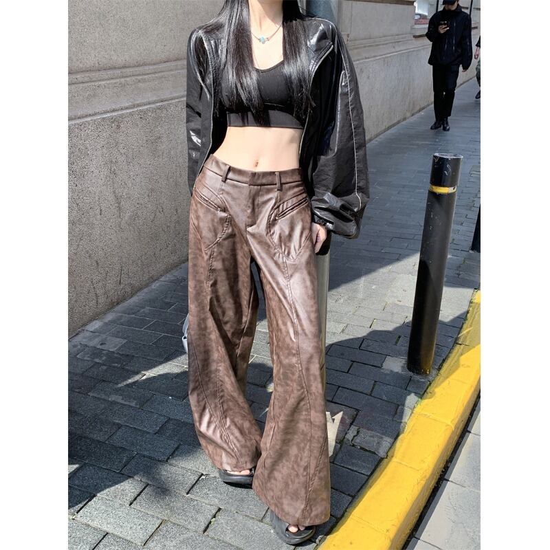 レトロなスタイルのカジュアルレザーパンツの女性の 2023 夏の新しいハイウエストルーズ痩身ニッチ万能ワイドレッグパンツ ハイウェスト サマー 夏物 0921993768834228