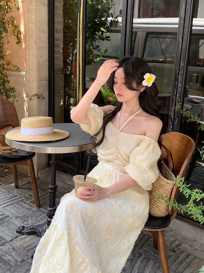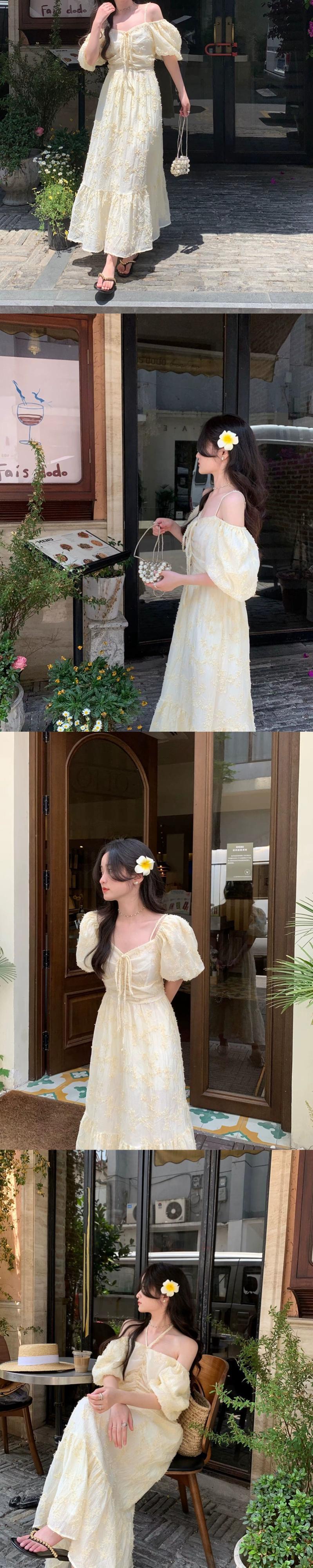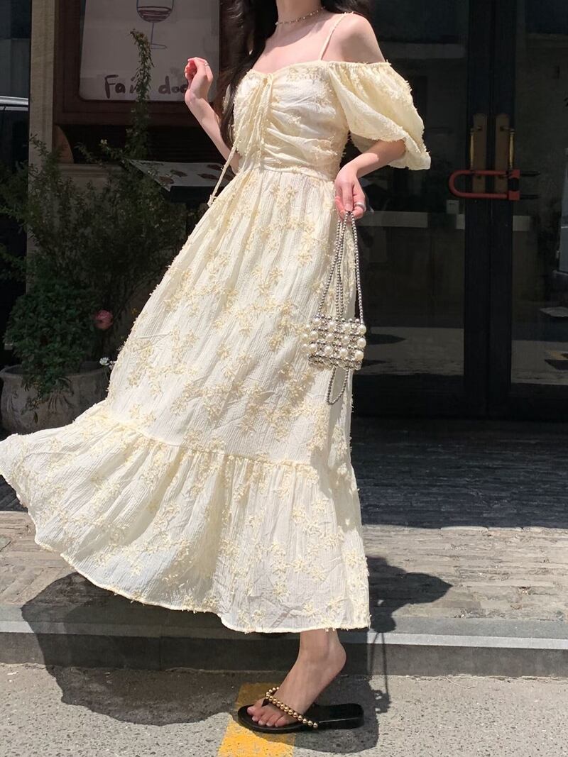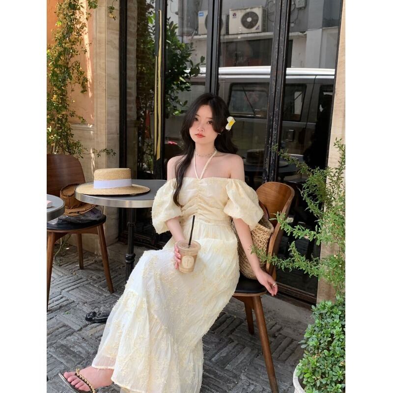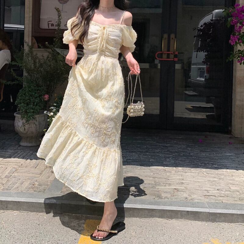 花刺繍ワンショルダーパフスリーブホルターネックドレスレディース2023夏新作スリムミドルスカート サマー 夏物 フラワーデザイン 0921941132400315