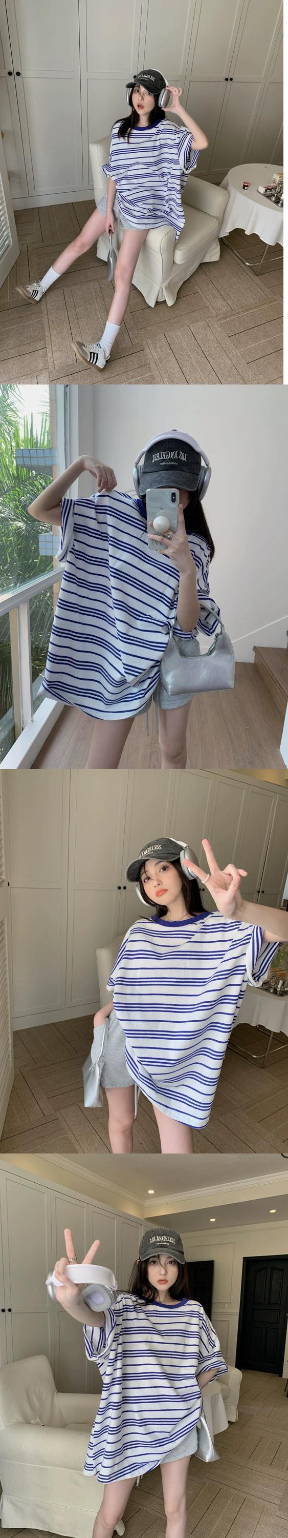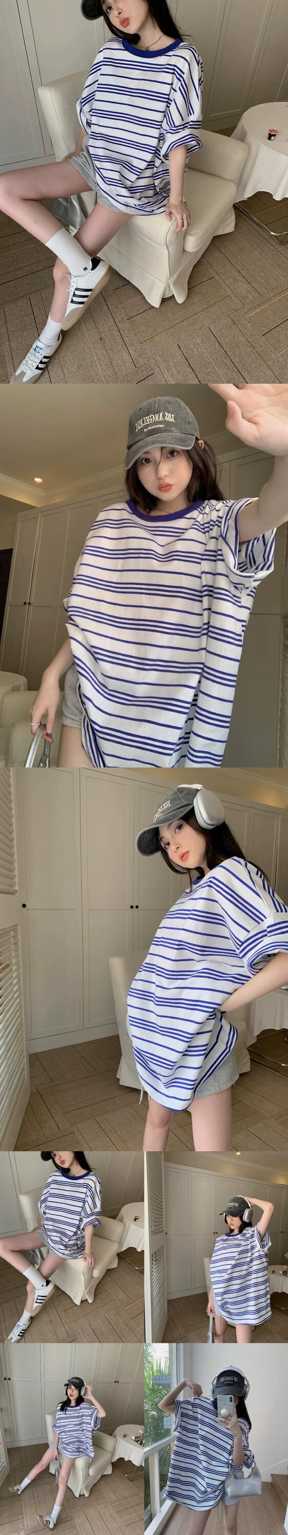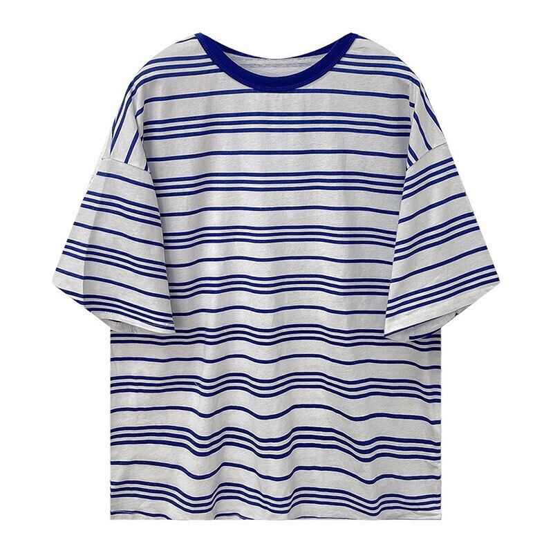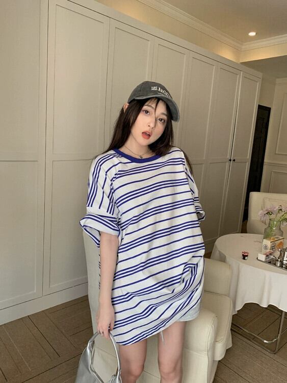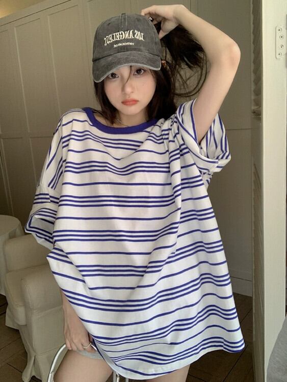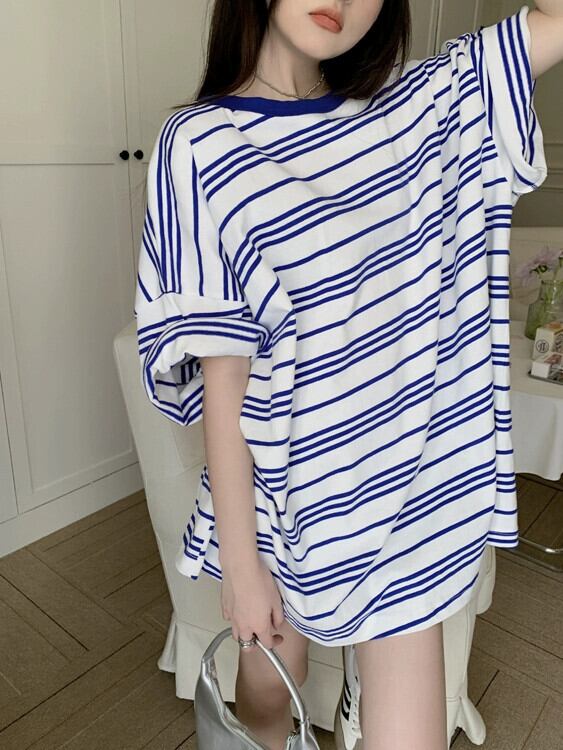 デザインセンスストライプラウンドネック半袖 Tシャツレディース 2023 夏の新作ミッドレングスルーズスリムトップトレンド サマー 夏物 Oネック 0921949114341822