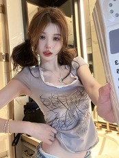 スイートクールレースステッチ半袖Tシャツレディース2023年夏新作スリムフィットショートデザインセンスプリントトップス 大人ガーリー スウィート キュート カジュアル サマー 夏物 0921978980087233