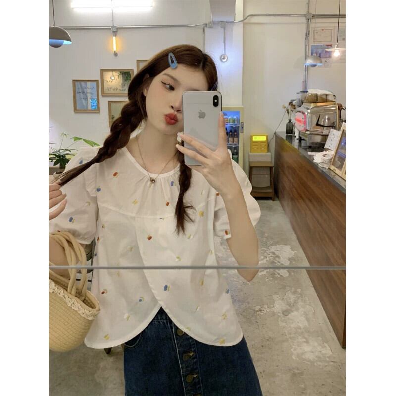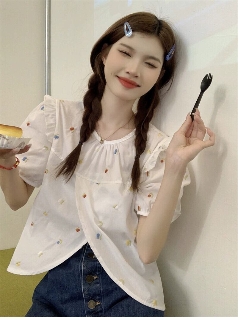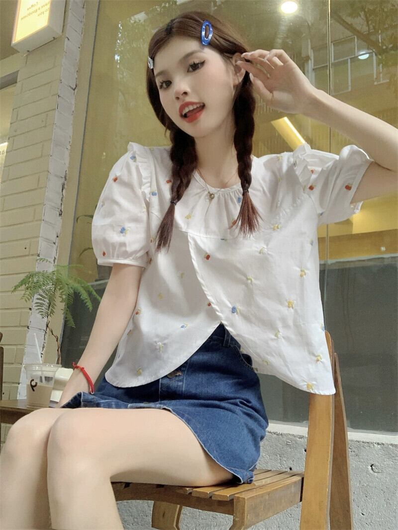 フレンチ木耳サイド刺繍半袖シャツレディース2023夏新作モリショートイレギュラーアウターシャツ潮 サマー 夏物 0921973595409972