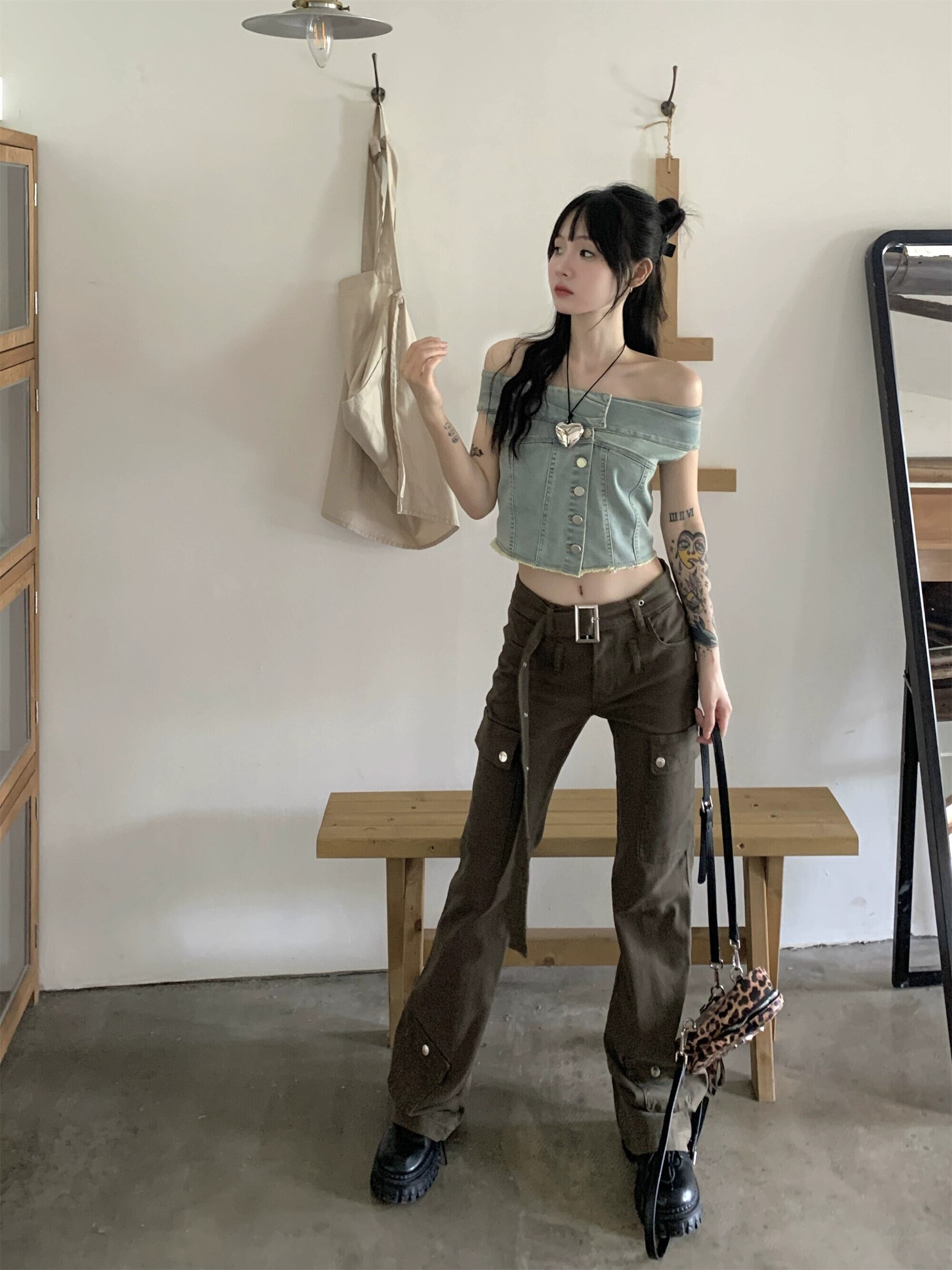 ホットワンショルダーデニムベストチューブトップ女性の夏の2023新しい気質ショートセクションスリムスリムカーディガントップ サマー 夏物 0921926173633795
