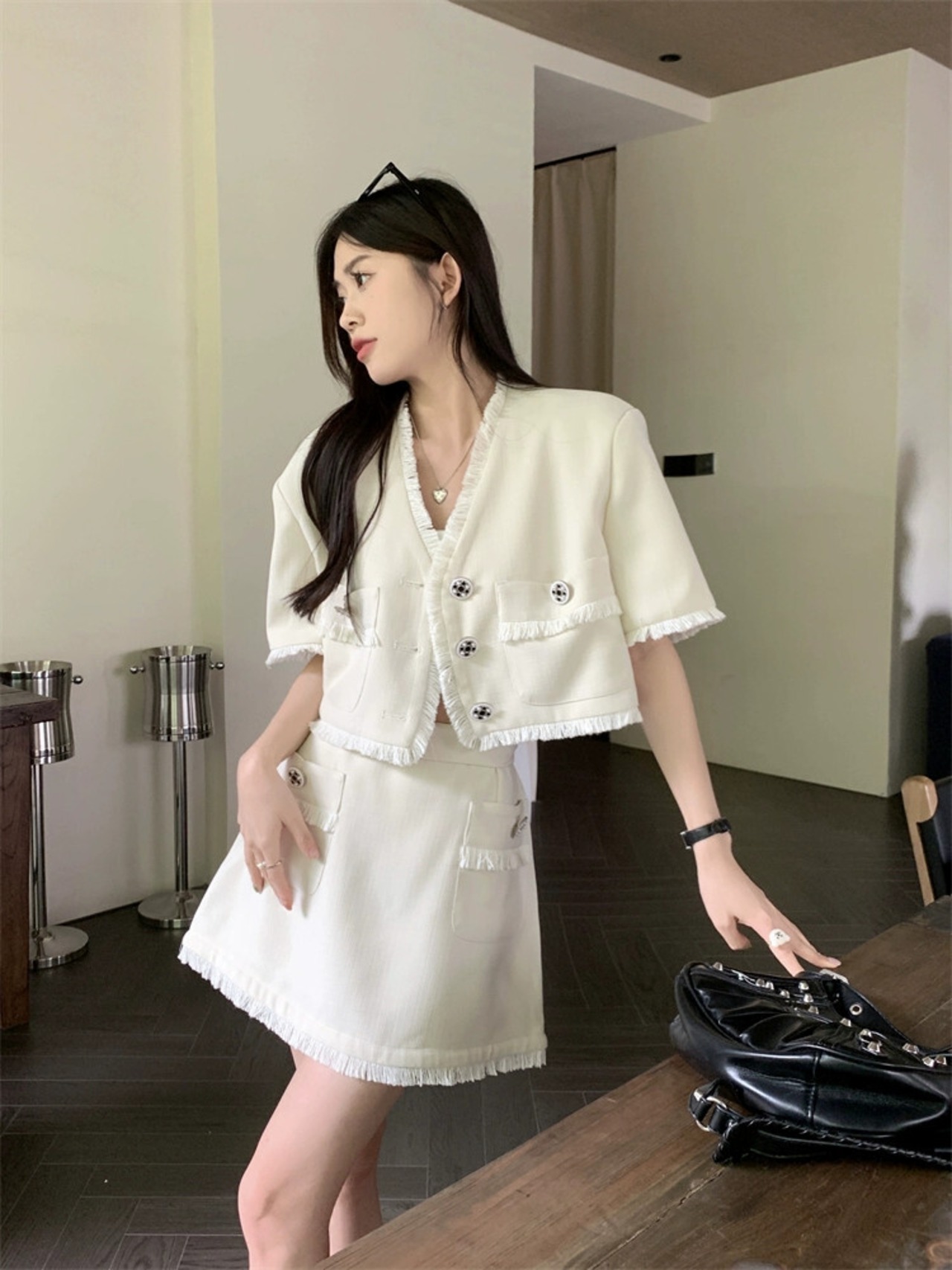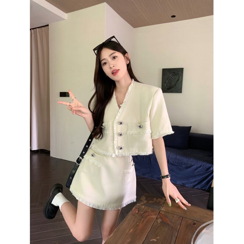 気質セレブスモールフレグランススーツレディース2023夏新作Vネックテルショートコートハイウエストスカート2点セット ハイウェスト サマー 夏物 092195198234039