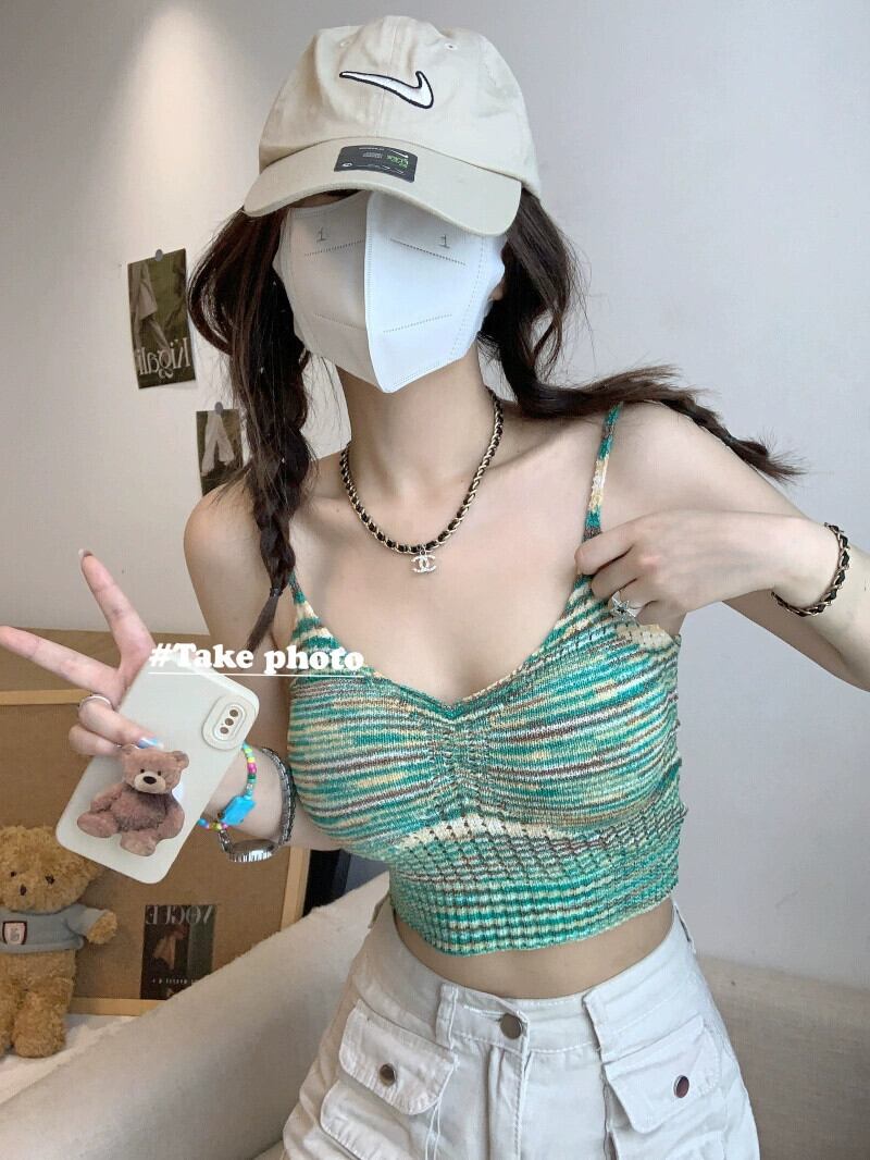 Sweet Spice Girls Vネック カラーニットキャミソール レディース 夏 アウター 胸パッド付き スリム ショート トップス 大人ガーリー スウィート キュート カジュアル サマー 夏物 0921998023247423