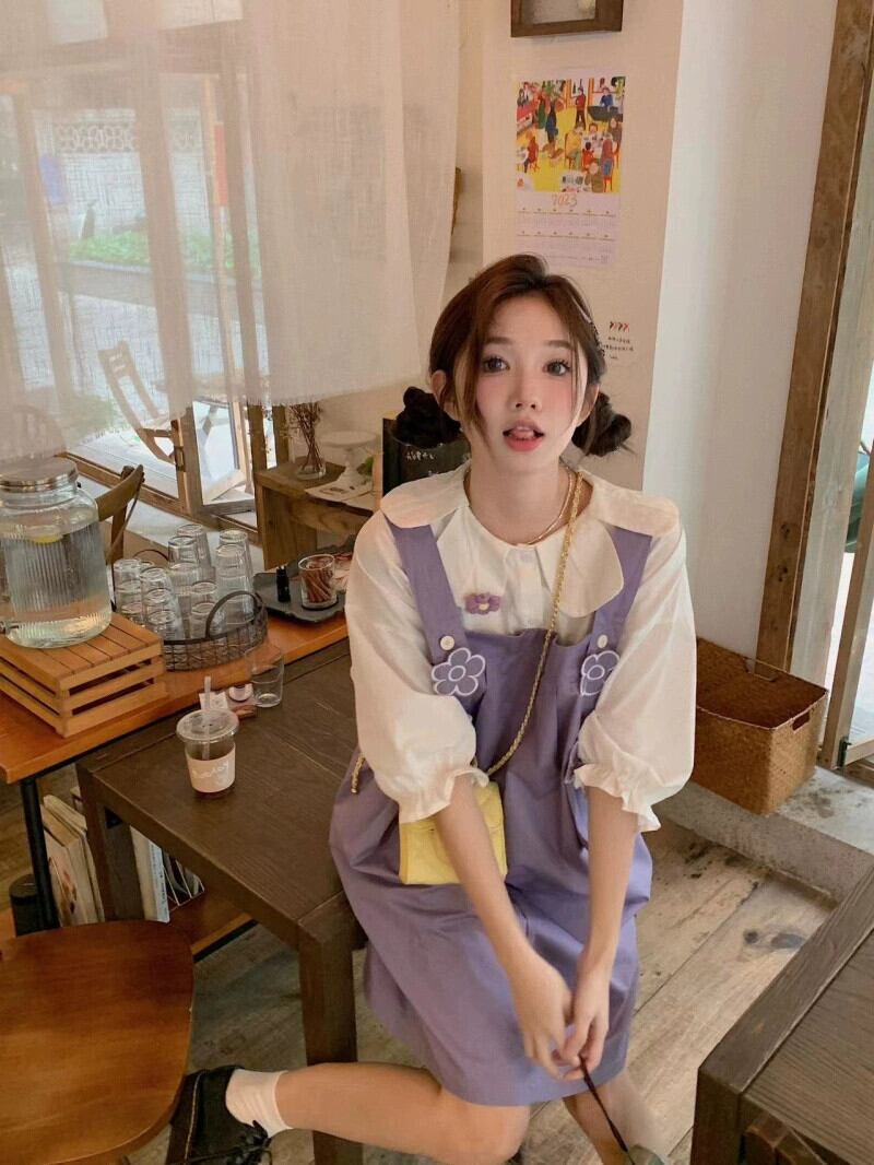甘い年齢低減スーツスカート女性の夏の 2023 新しい花びらカラーシャツ紫色のサスペンダースカート 2 点セット 大人ガーリー スウィート キュート カジュアル サマー 夏物 パープル 0921984600656932