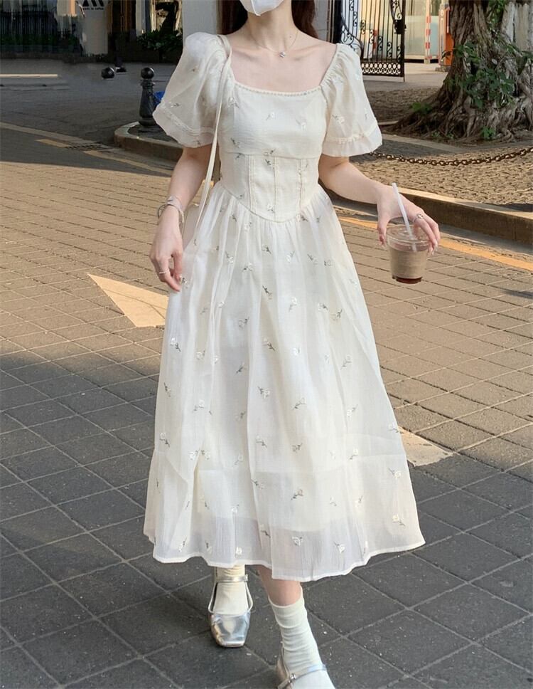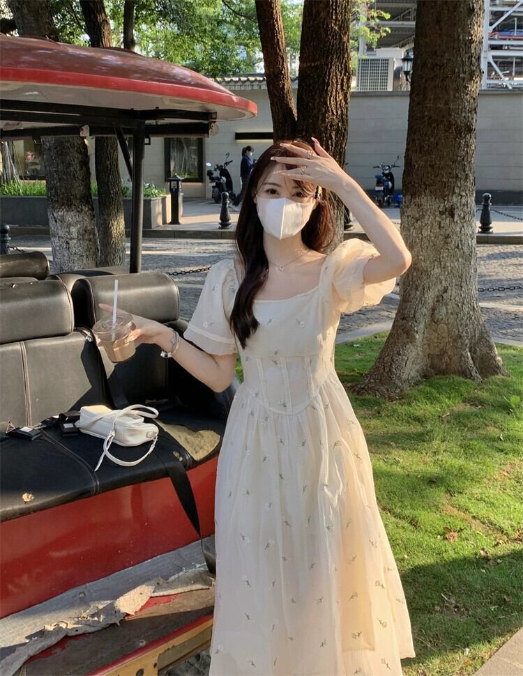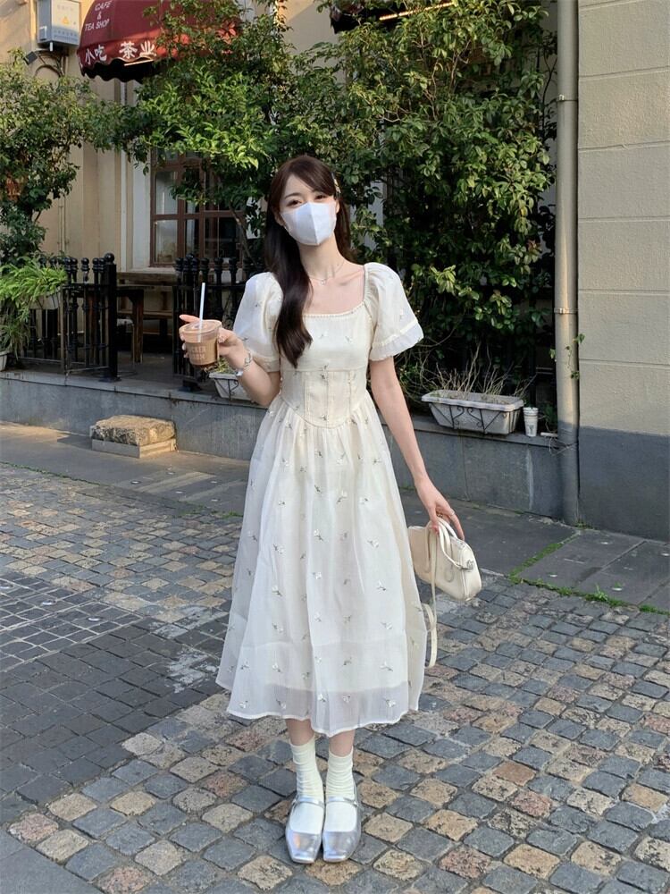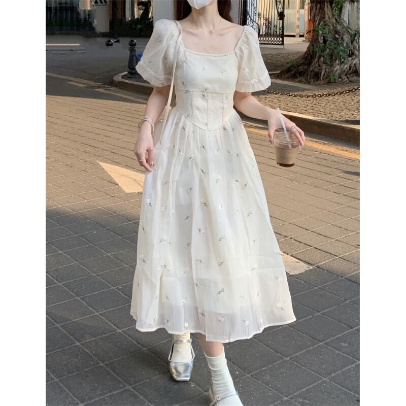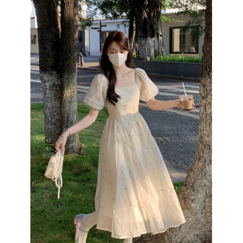 フレンチレトロスクエアカラー半袖ドレスの女性の夏の2023新しいスタイルの気質スリムスリムミドル丈ティーブレイクスカート サマー 夏物 スクウェア 0921922349302411