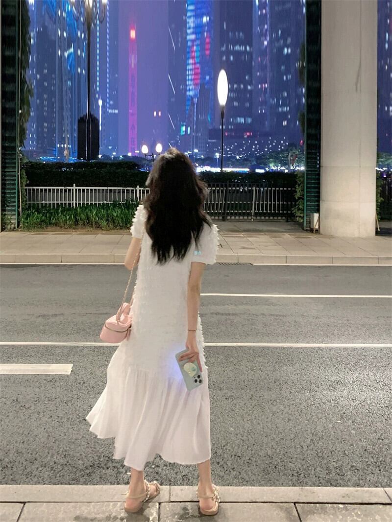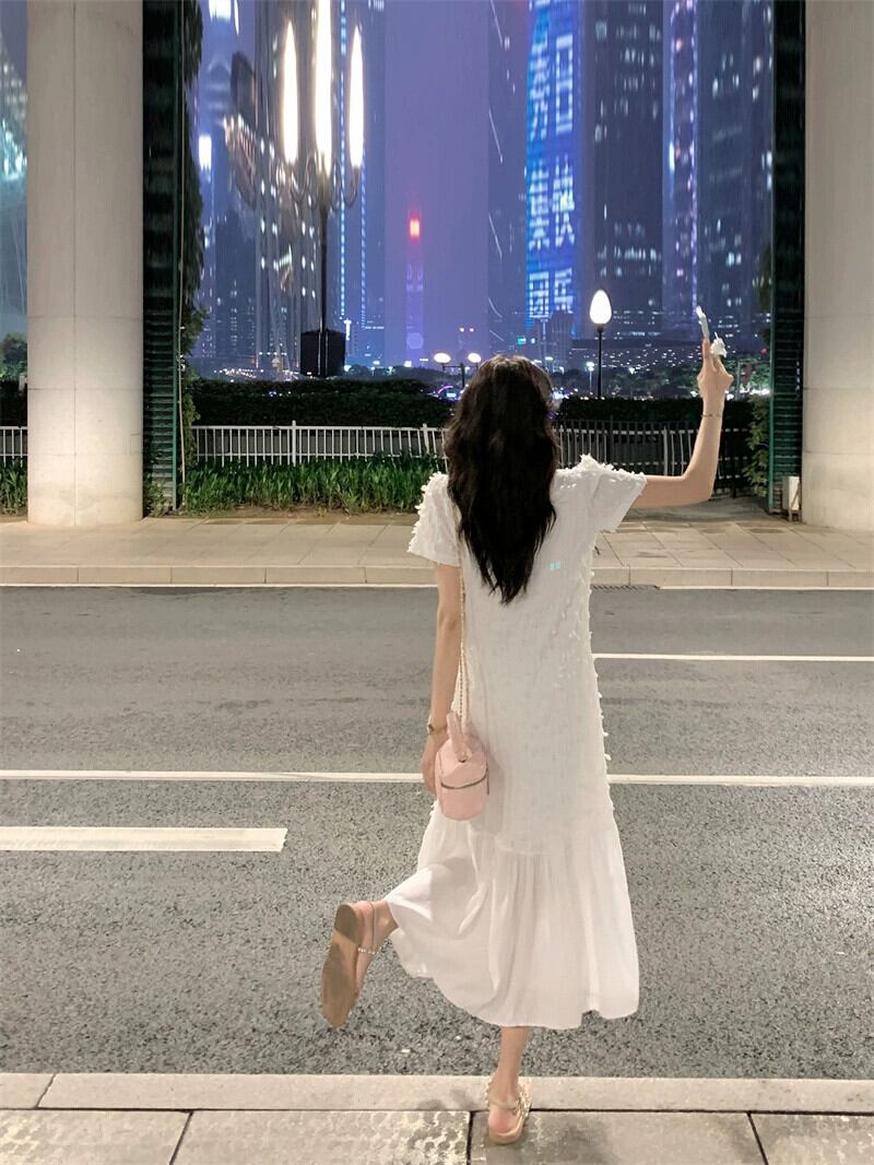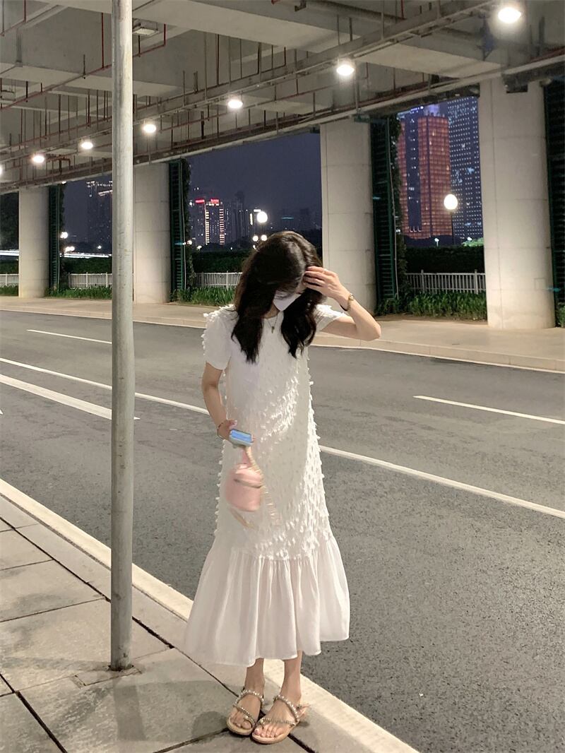 フレンチスタイルの白い優しい風半袖ドレスの女性の夏の2023新しい気質薄いオールマッチミドル丈スカート ホワイト サマー 夏物 0921928868958685