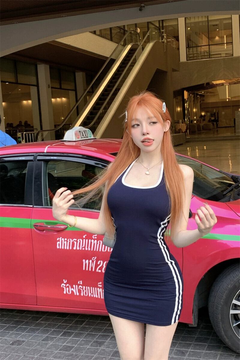 アメリカンスタイルのセクシーな風ぶら下げネックドレス女性の夏 2023 新色コントラストストライプ風露バックパックヒップスカート サマー 夏物 リュック 0921961047780202