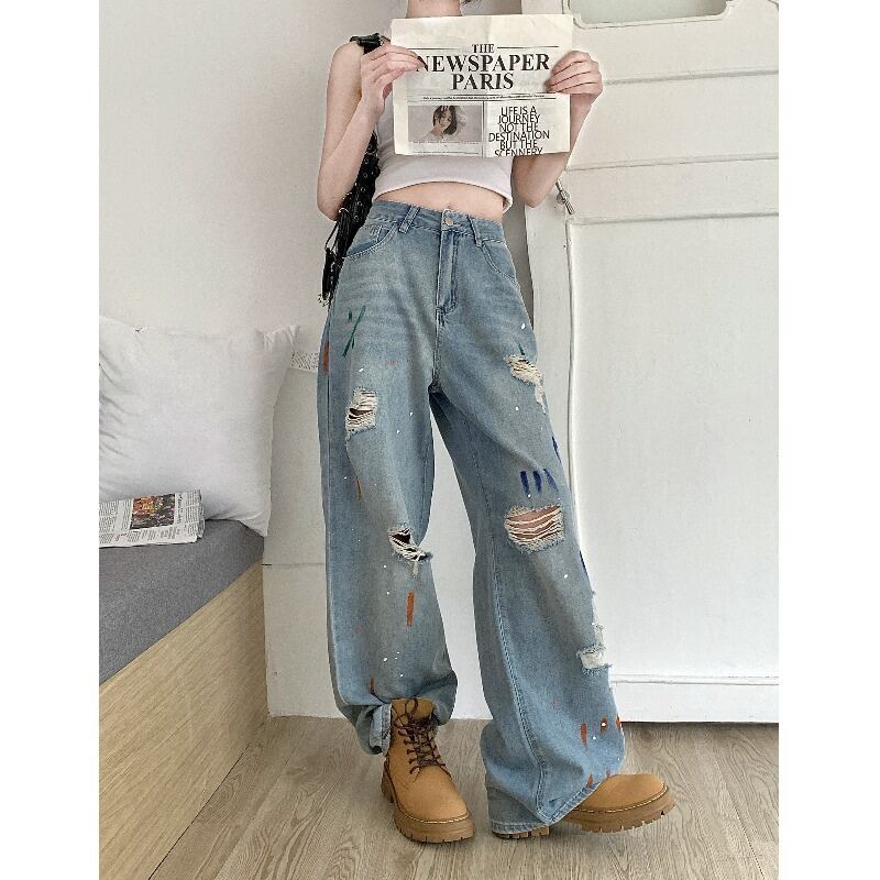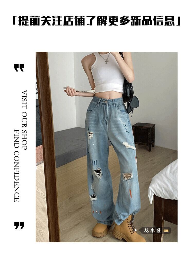 オールマッチハイウエスト薄いリップドジーンズレディース2023年夏新しい気質アウタールーズワイドレッグモップパンツ ハイウェスト サマー 夏物 0921917486077433