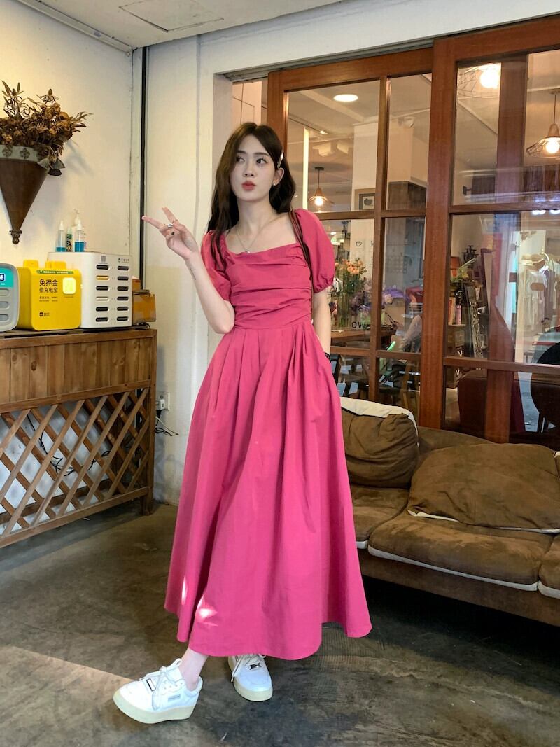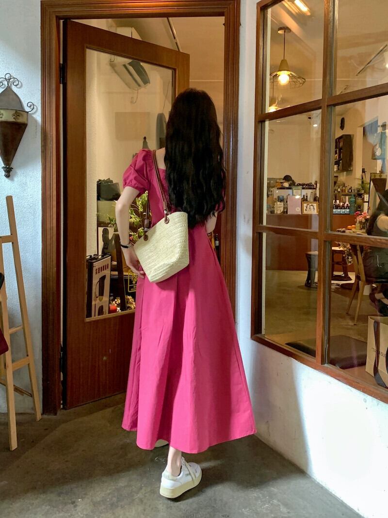フレンチスタイルの優しい風スクエアカラー半袖ドレスの女性の夏の 2023 新しいオールマッチ自己修養痩身ミドル丈スカート サマー 夏物 スクウェア 092199497913162