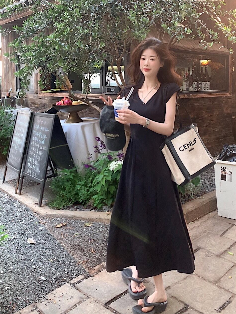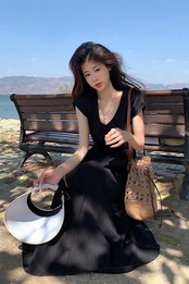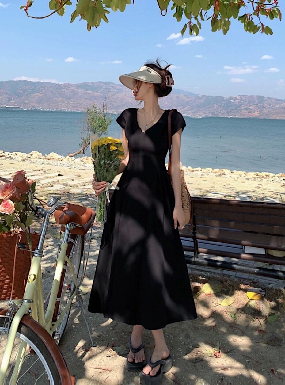 レトロヘボンスタイル黒 V ネック半袖ドレス女性の夏の 2023 新しい気質スリムスリムミドル丈スカート ブラック サマー 夏物 Vネック 0921948461026079
