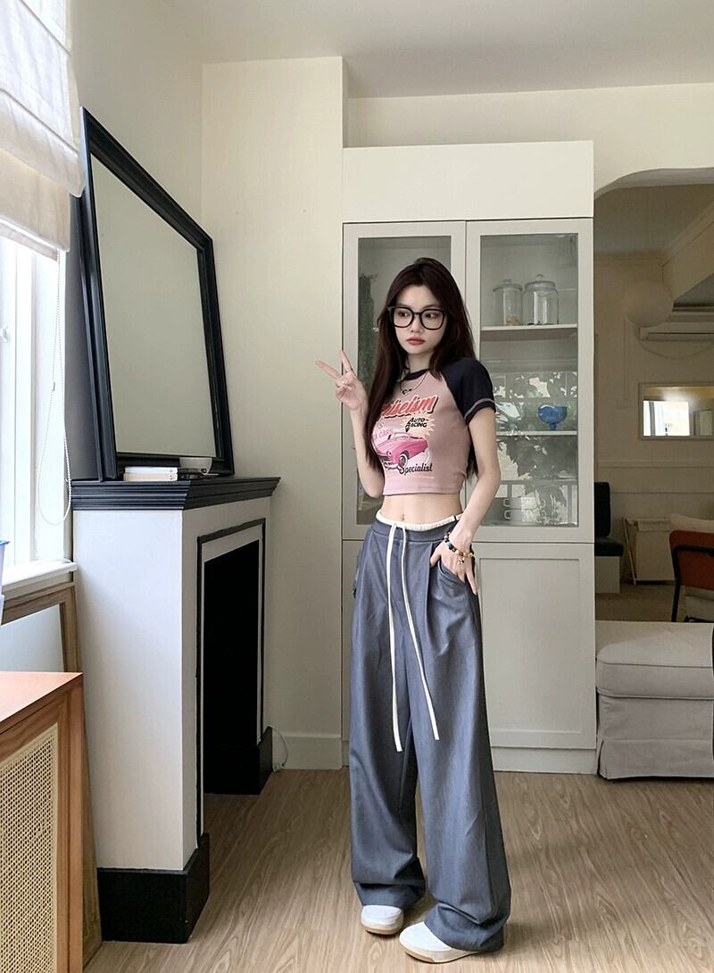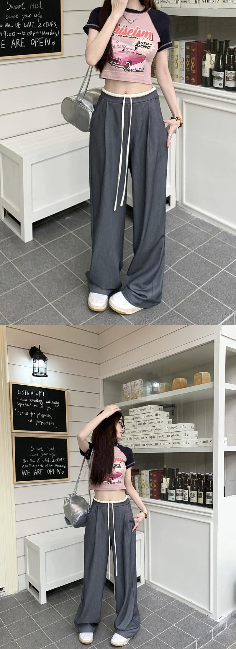 弾性ウエスト薄い巾着カジュアルパンツ女性の夏の 2023 新しい気質オールマッチルーズワイドレッグモップスーツパンツ エラスティック 伸縮 サマー 夏物 092195129833667