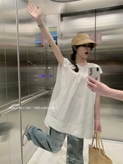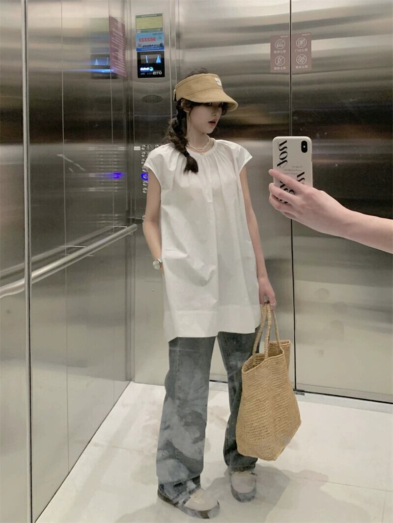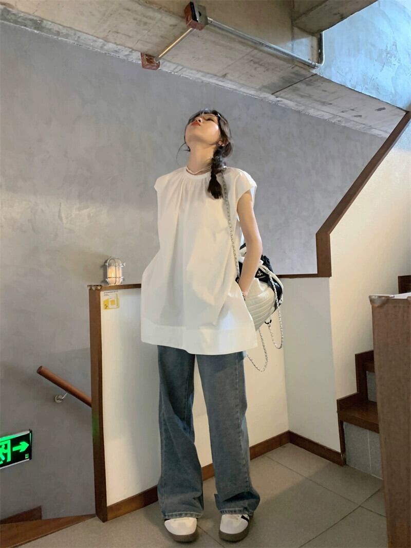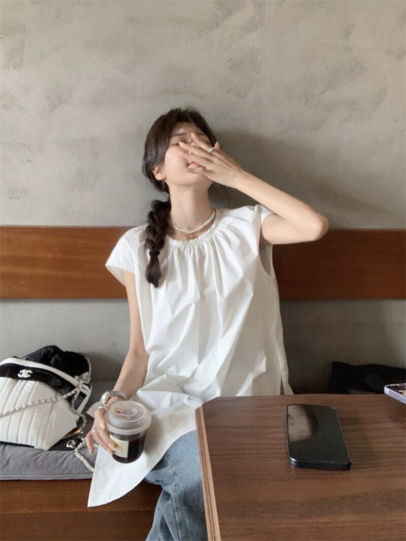 フランスの気質オールマッチノースリーブラウンドネックシャツレディース 2023 夏の新しいデザインセンスシックなファッションルーズトップ サマー 夏物 Oネック 0921999547695937