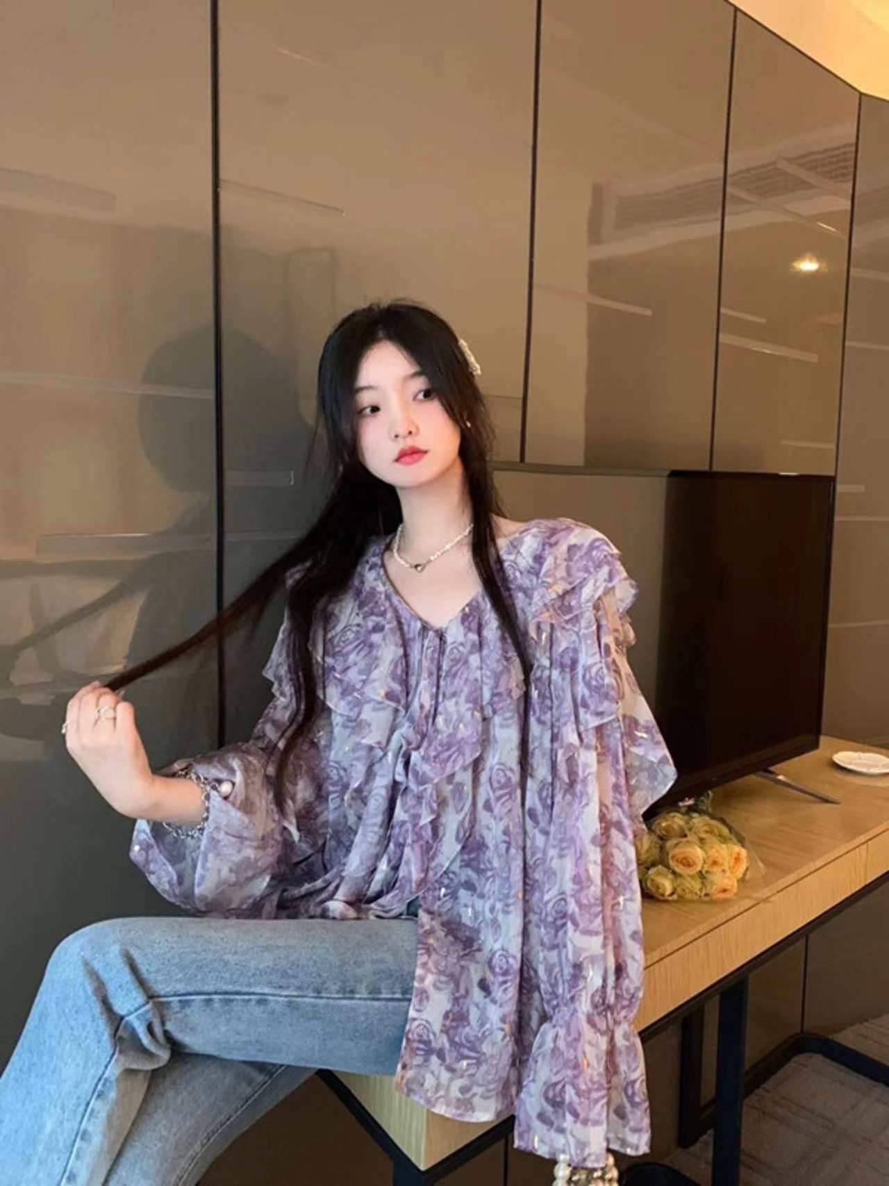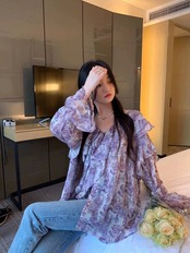 フランスの気質 V ネック長袖日焼け止め花柄シャツ女性の夏のシフォンシャツフリルネクタイシックなトップ ロング サマー 夏物 Vネック 0921919073837815