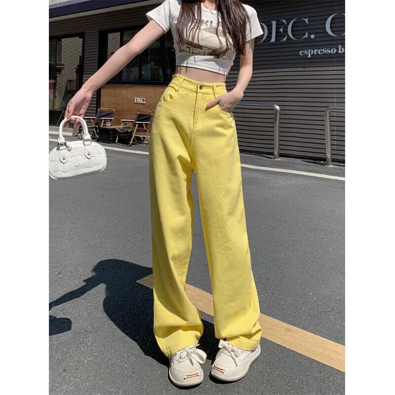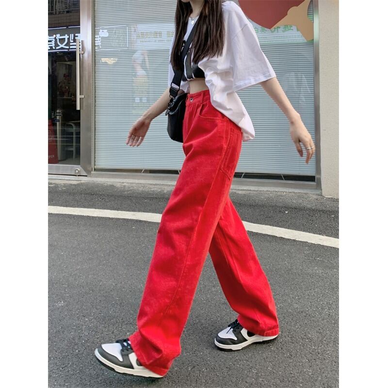 キャンディーカラーのハイウエスト ストレート ジーンズの女性の 2023 年夏新しいハイウエストのルーズで薄いオールマッチ ワイドレッグ パンツのバージョン レッド サマー 夏物 0921912373692652