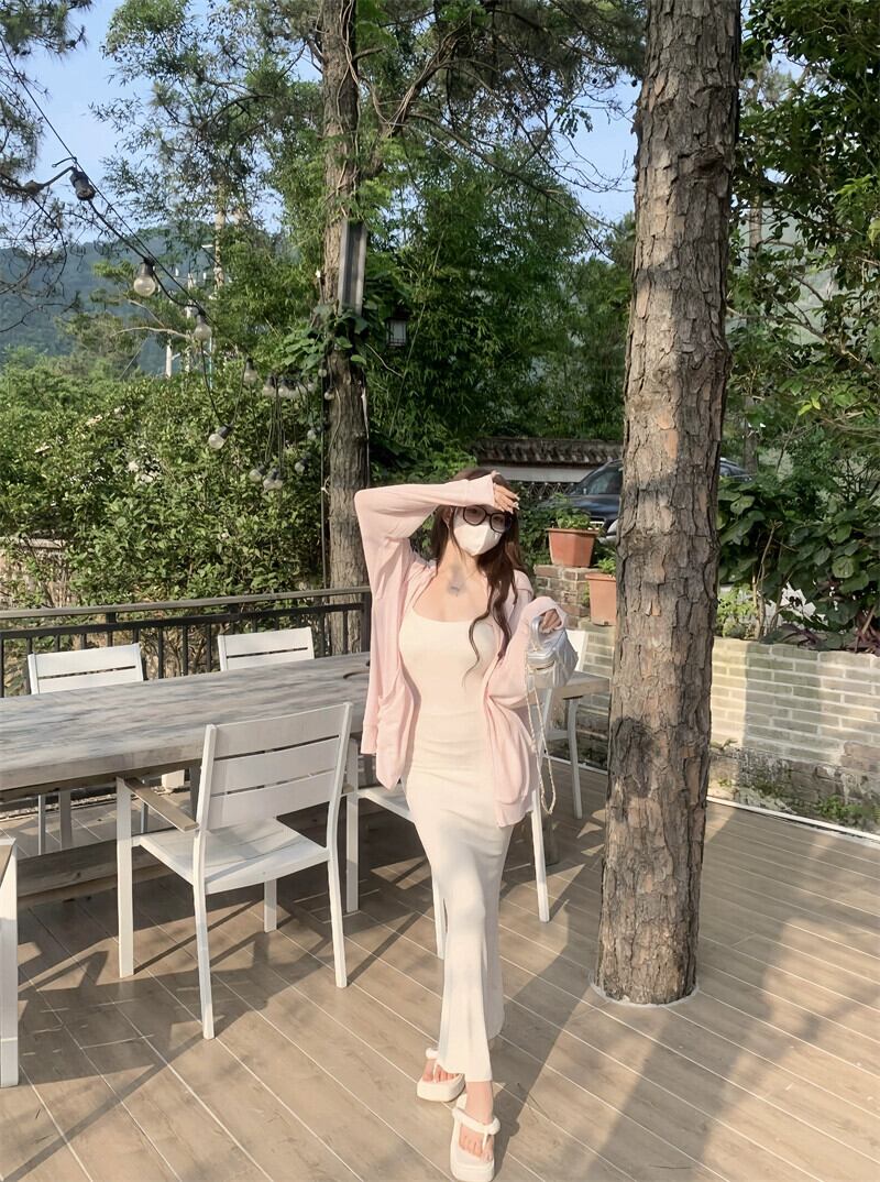 色:カーキカーディガン,ピンクのカーディガン,白い短いスカート,黒スカート,コーヒースカート,オフホワイトのドレス,黒いドレス,コーヒー色のドレス