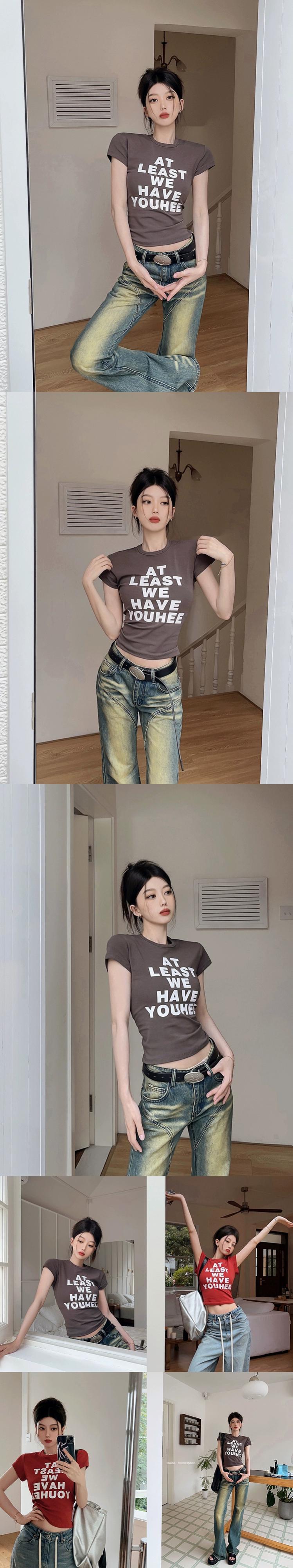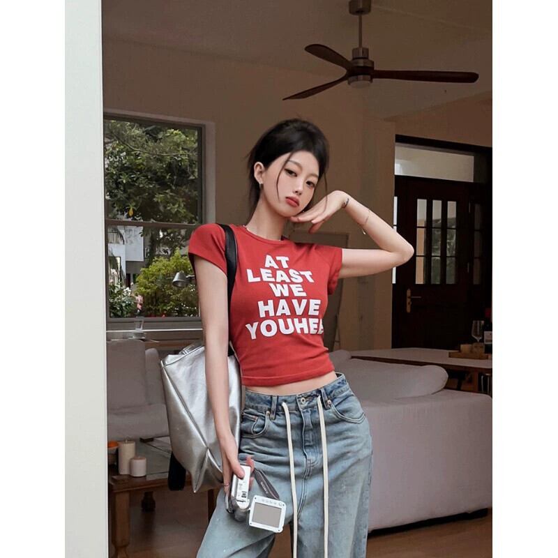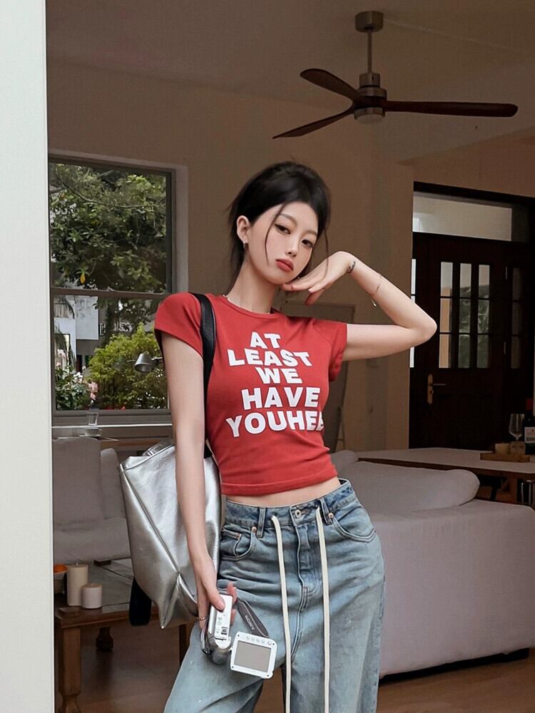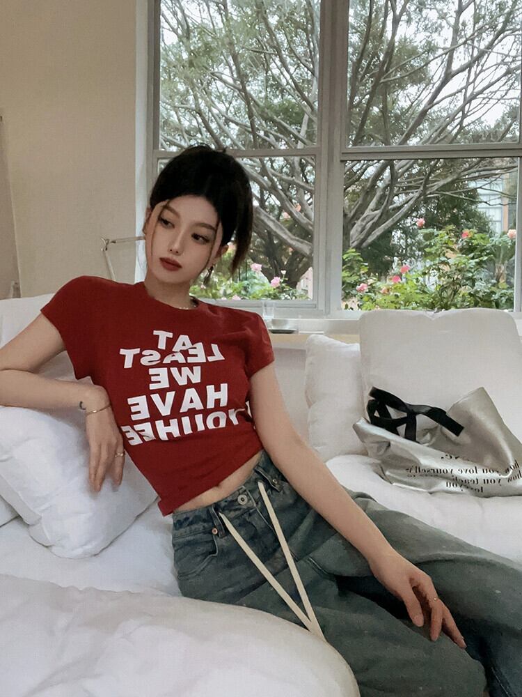 アメリカンレトロプリントレターTシャツレディース夏純粋な欲望風自己修養ショート半袖ショルダーレッドトップ サマー 夏物 ピュア 0921921243071835