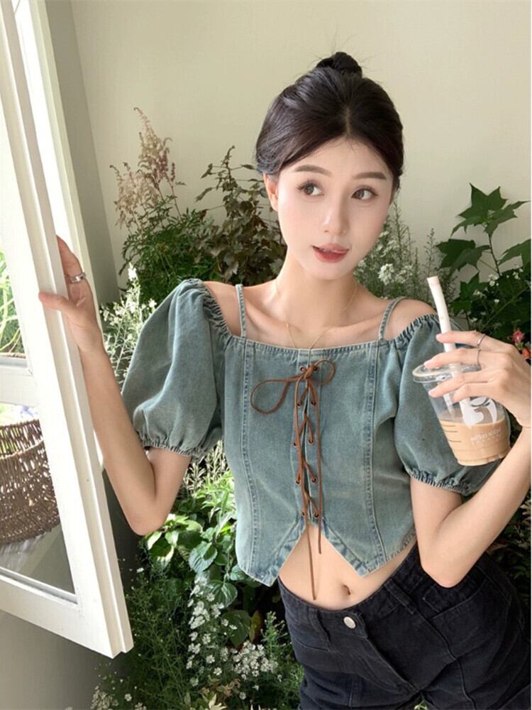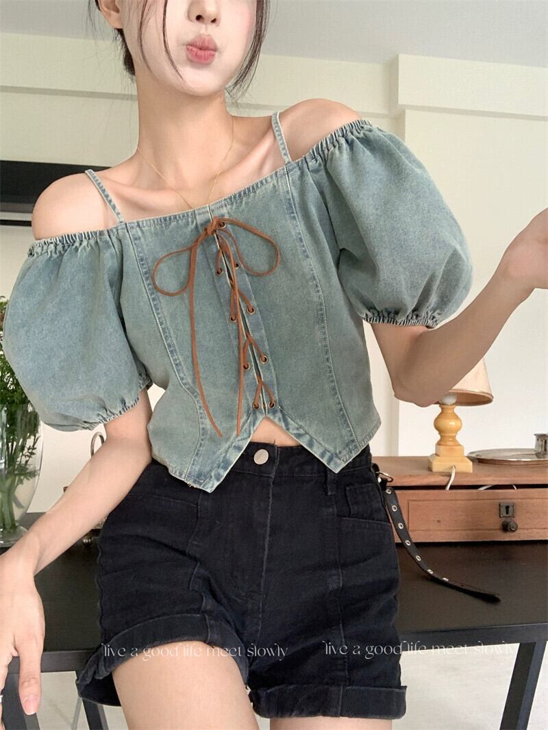 レトロな気質一言襟デニムシャツレディース 2023 夏の新しいニッチストラップデザイン半袖トップ サマー 夏物 0921997407897324
