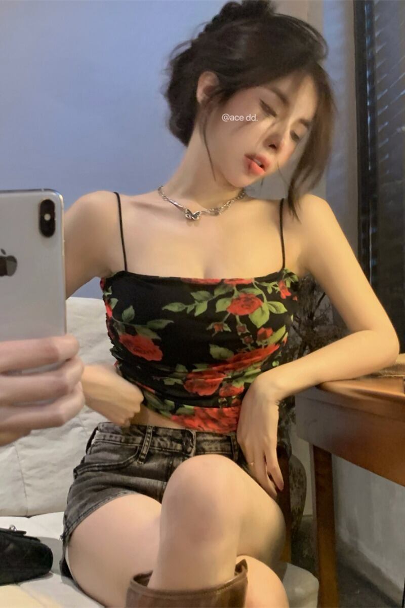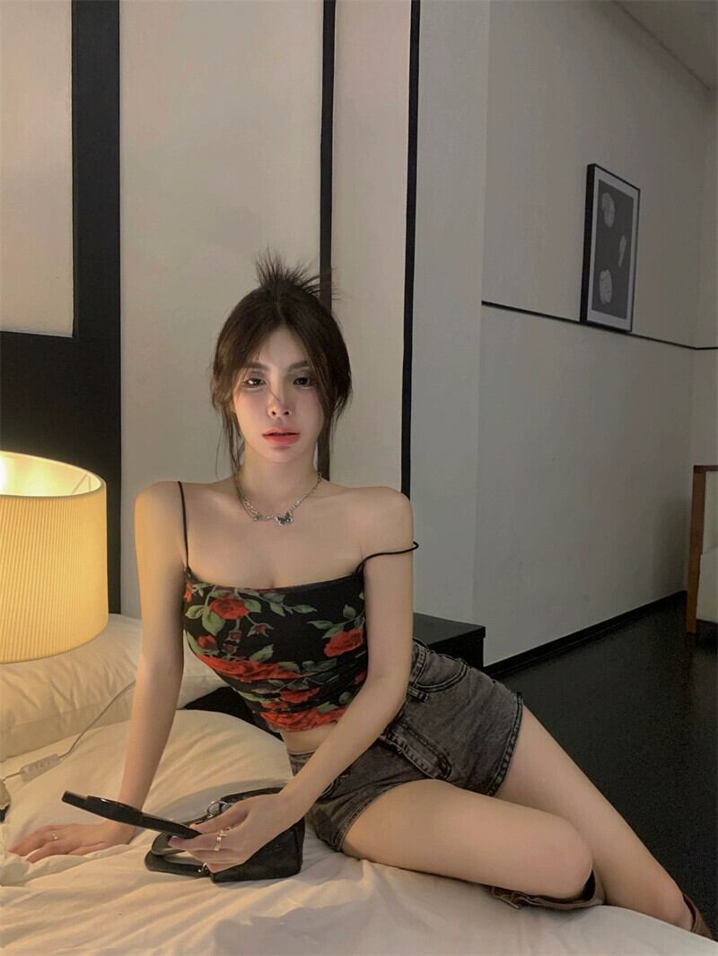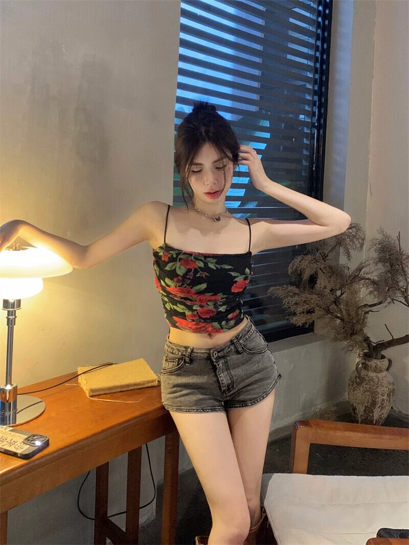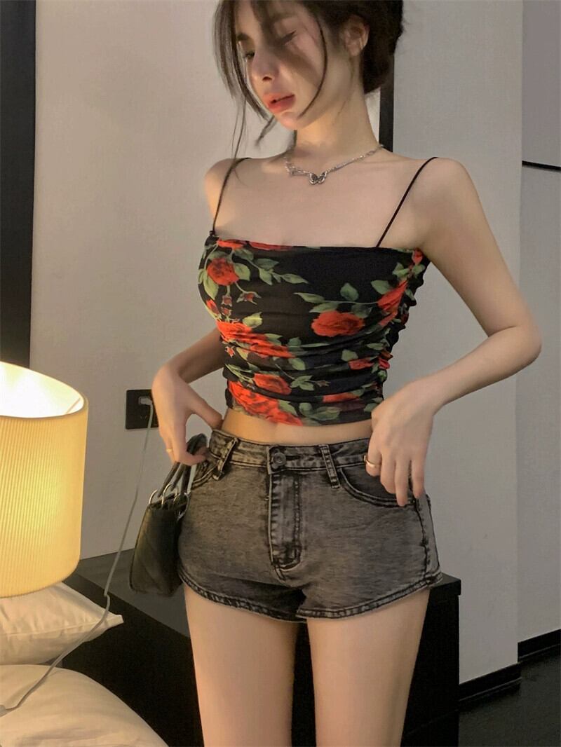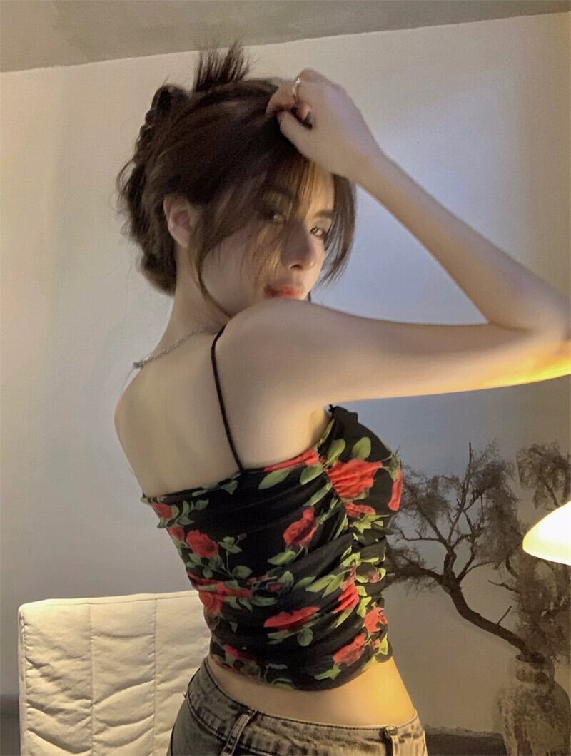 レトロローズプリント弾性メッシュキャミソールレディース夏 2023 ショートスリムスリムトップ エラスティック 伸縮 サマー 夏物 0921921551115507