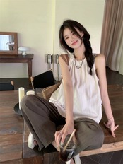 バージョンの緩いラウンドネックプリーツキャミソール婦人服夏 2023 新しいスタイルのアウターウェア痩身オールマッチノースリーブトップ サマー 夏物 Oネック 092194637191963
