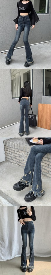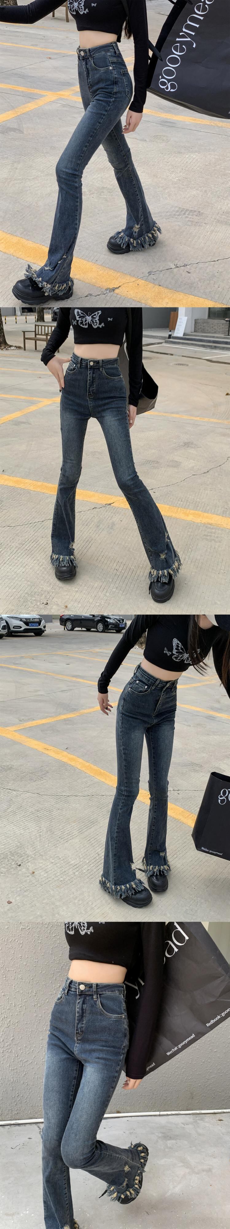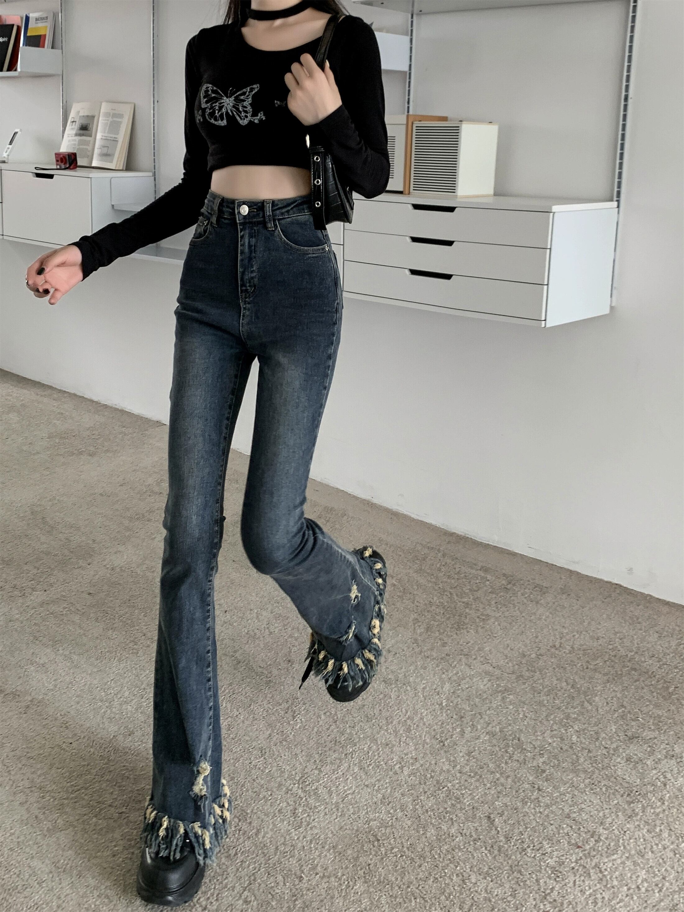 センスディープストリートタイトハイウエストジーンズレディース2023年夏新作リップドホールテルマイクロフレアパンツ レッド サマー 夏物 092192454400401