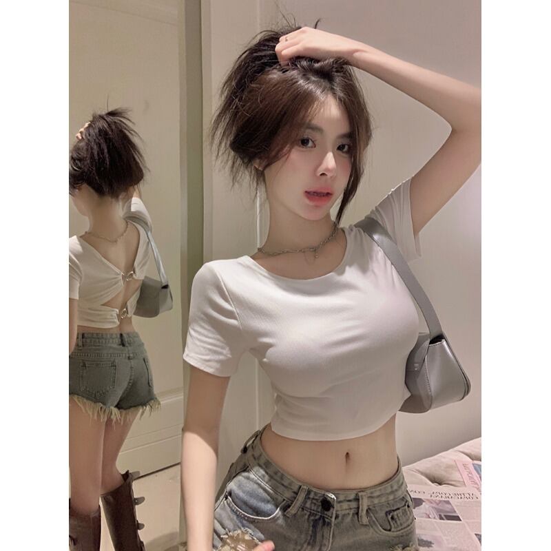 アメリカンスタイルのセクシーな背中の開いた半袖Tシャツレディース2023年夏新しいデザインセンスのスリムフィットと薄いショートクロップトップ サマー 夏物 0921989102844302