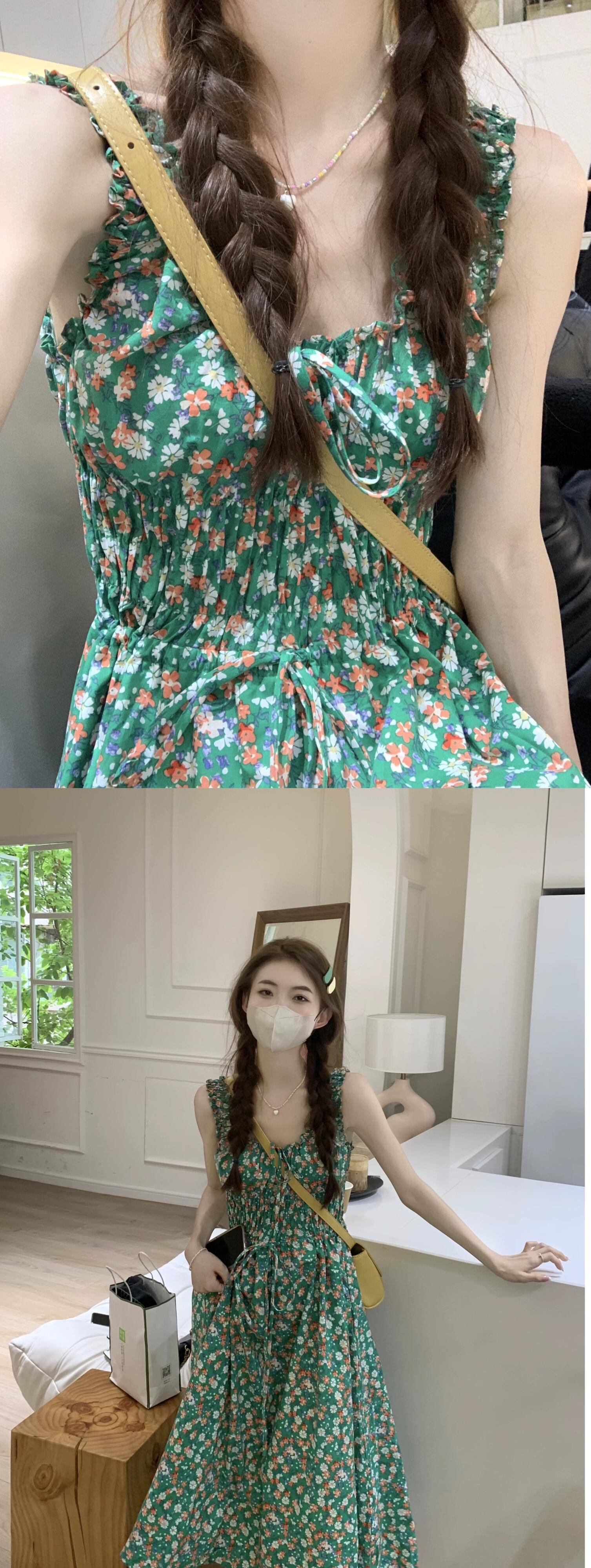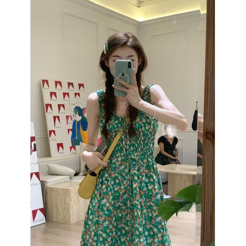 レトログリーン花柄スリングドレス女性の夏エストロングスカート甘いプリーツネクタイウエストaラインスカート 大人ガーリー スウィート キュート カジュアル サマー 夏物 0921950396953103
