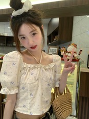 フレンチフローラルスクエアネックパフスリーブシャツ女性の夏の優しい風スリムショートシャツニッチセンストップス サマー 夏物 花柄 スクウェア 0921983174538718