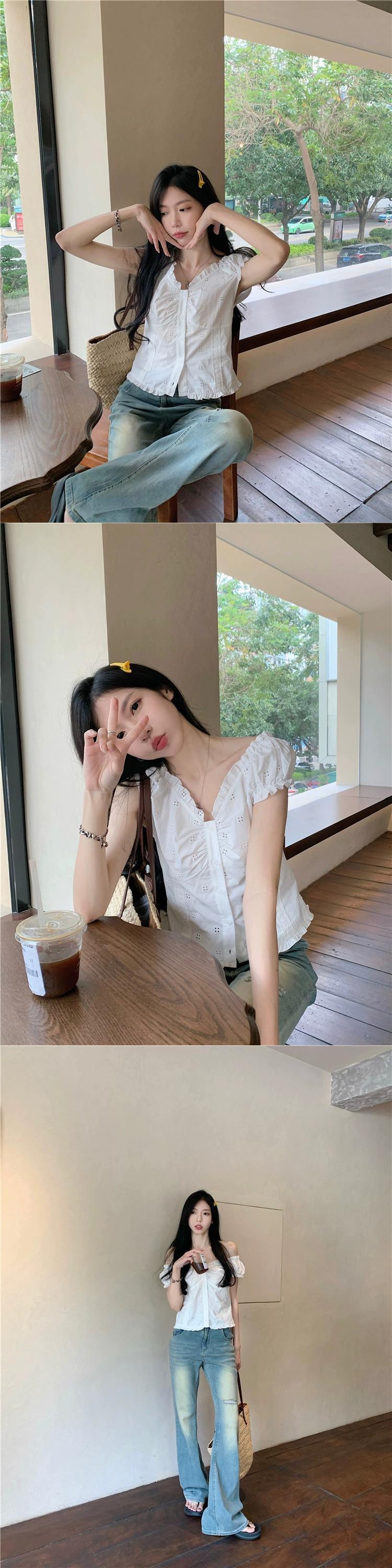 レトロな優しい白 V ネックバブル半袖シャツ女性の 2023 夏の新しいデザインセンスニッチレーストップ ホワイト サマー 夏物 Vネック 0921975917118007