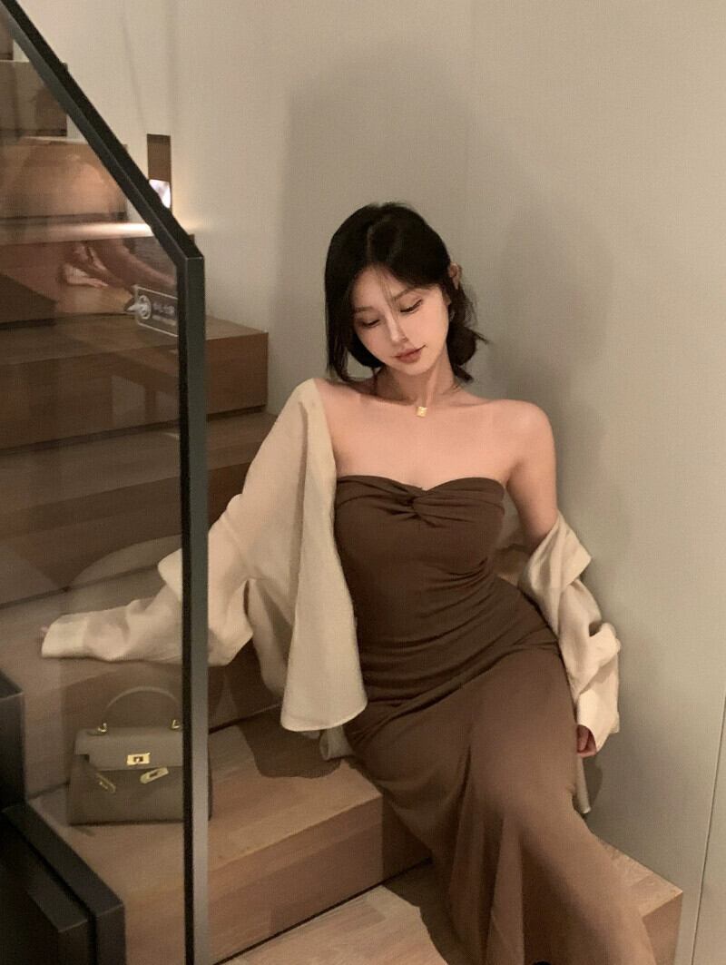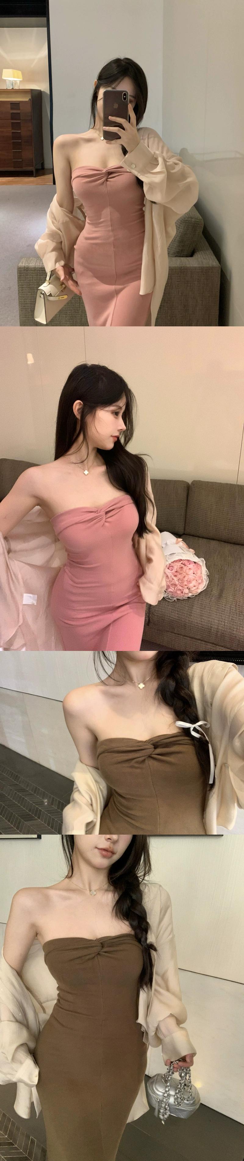 穏やかで気質的なピンクのチューブトップドレス女性の夏のウエストスリムバックレスロングスカートセクシーなフィッシュテールバッグヒップスカート サマー 夏物 0921987527622349