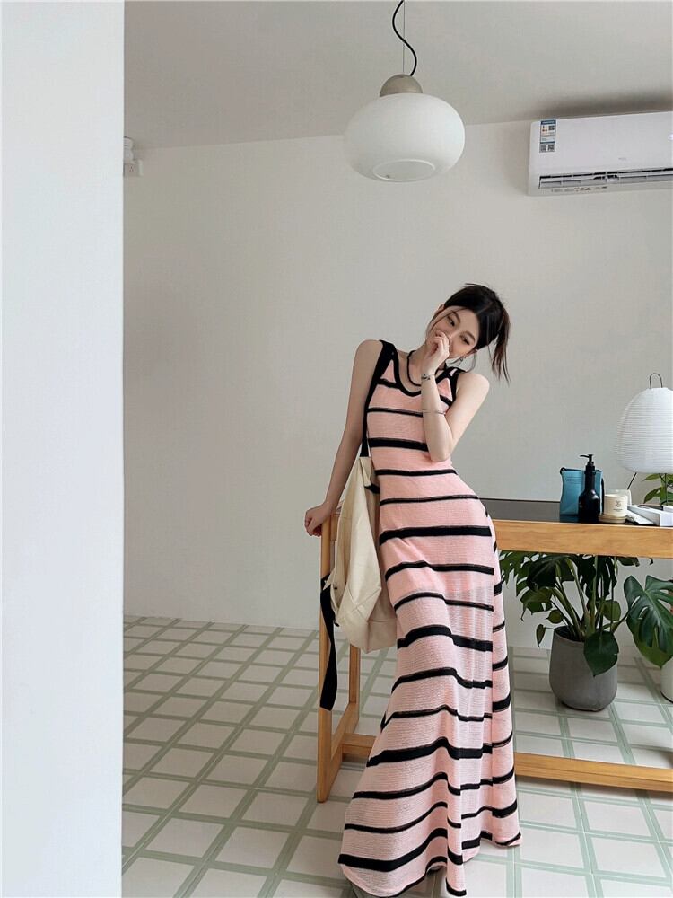 Ins スタイルのファッションカラーコントラストストライプベストドレス女性の夏の 2023 新しいスリムで薄いニットドレス サマー 夏物 0921926953472844