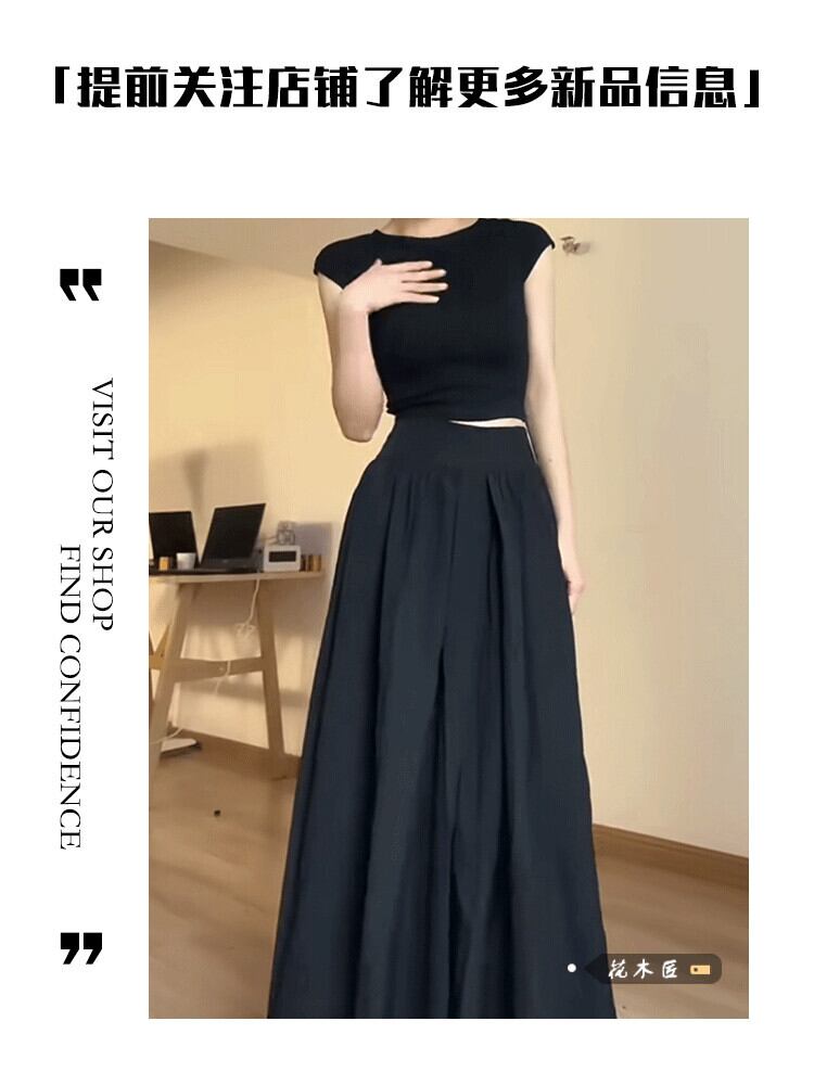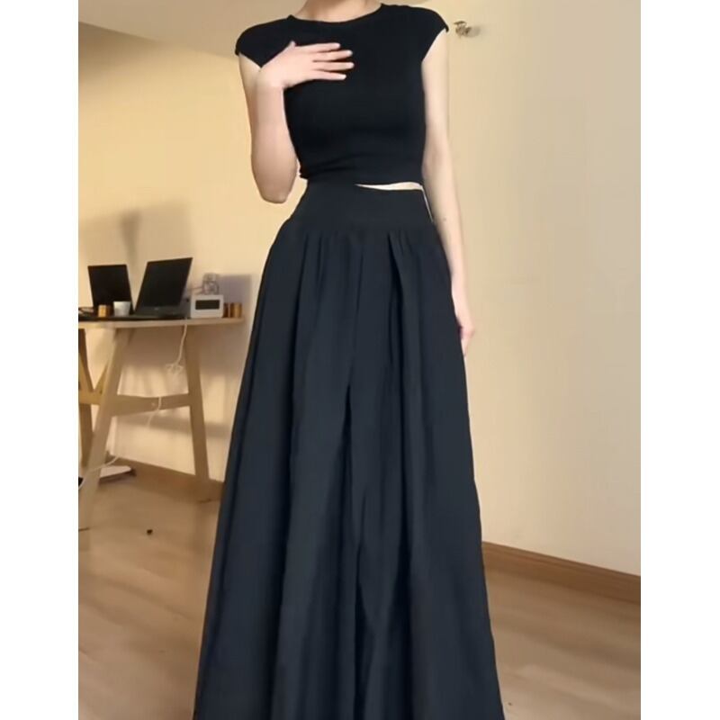 フレンチクールスーツ黒ショートTシャツレディース2023年夏新作ハイウエストロングスカート2点セット ハイウェスト ブラック サマー 夏物 0921984804193197