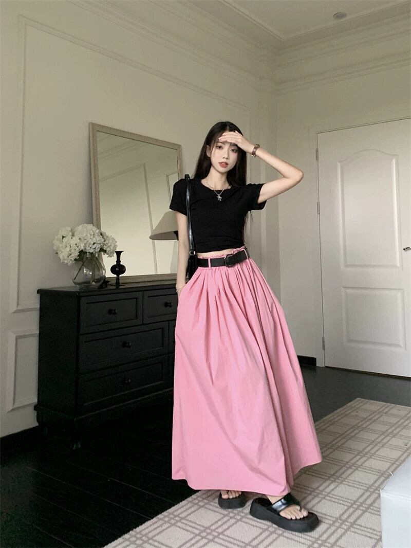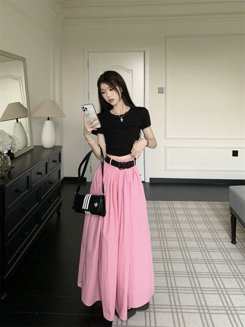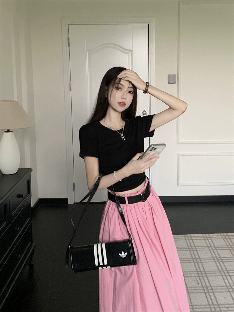 色:黒いTシャツ,ピンクのスカート