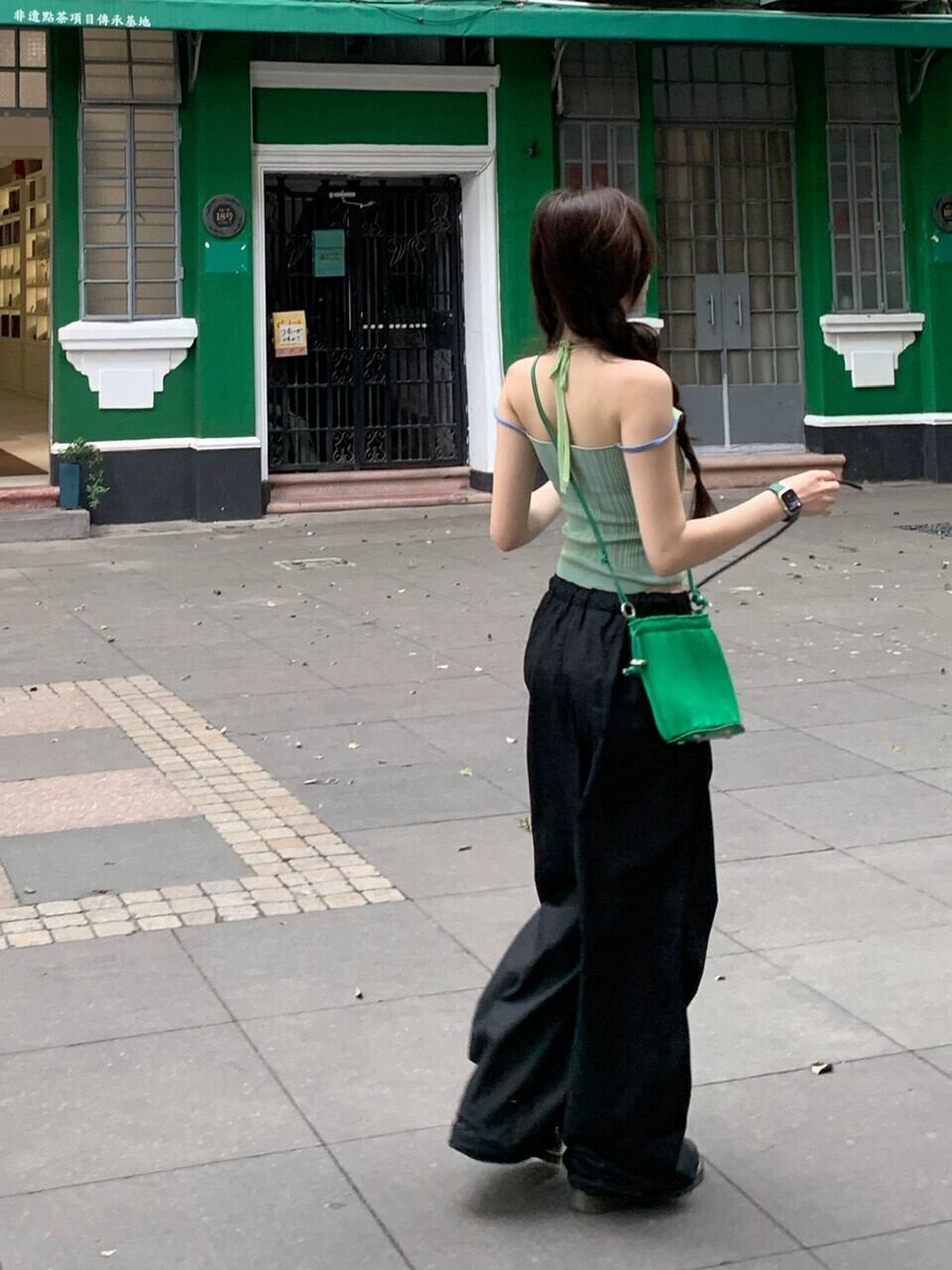 色:グリーンスリング,ピンクのサスペンダー,黒いズボン,アプリコットパンツ