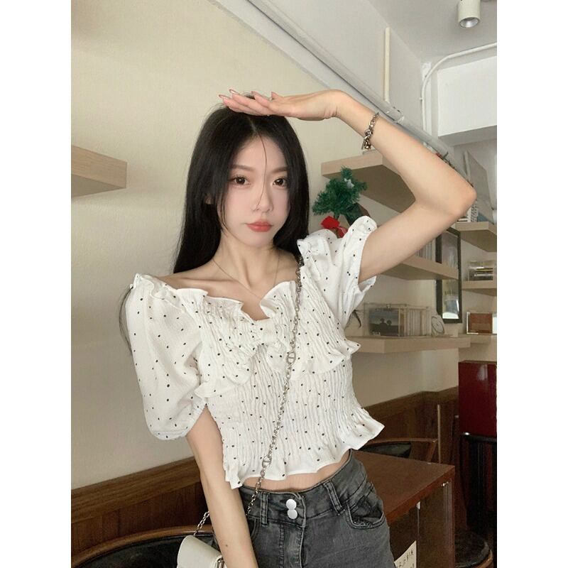 フレンチファッションショートポルカドットシャツレディース2023年夏新作優しくて甘いパフスリーブスリムフィットスリムトップ 大人ガーリー スウィート キュート カジュアル サマー 夏物 0921952707600307