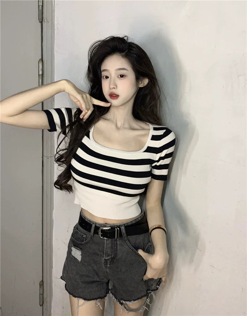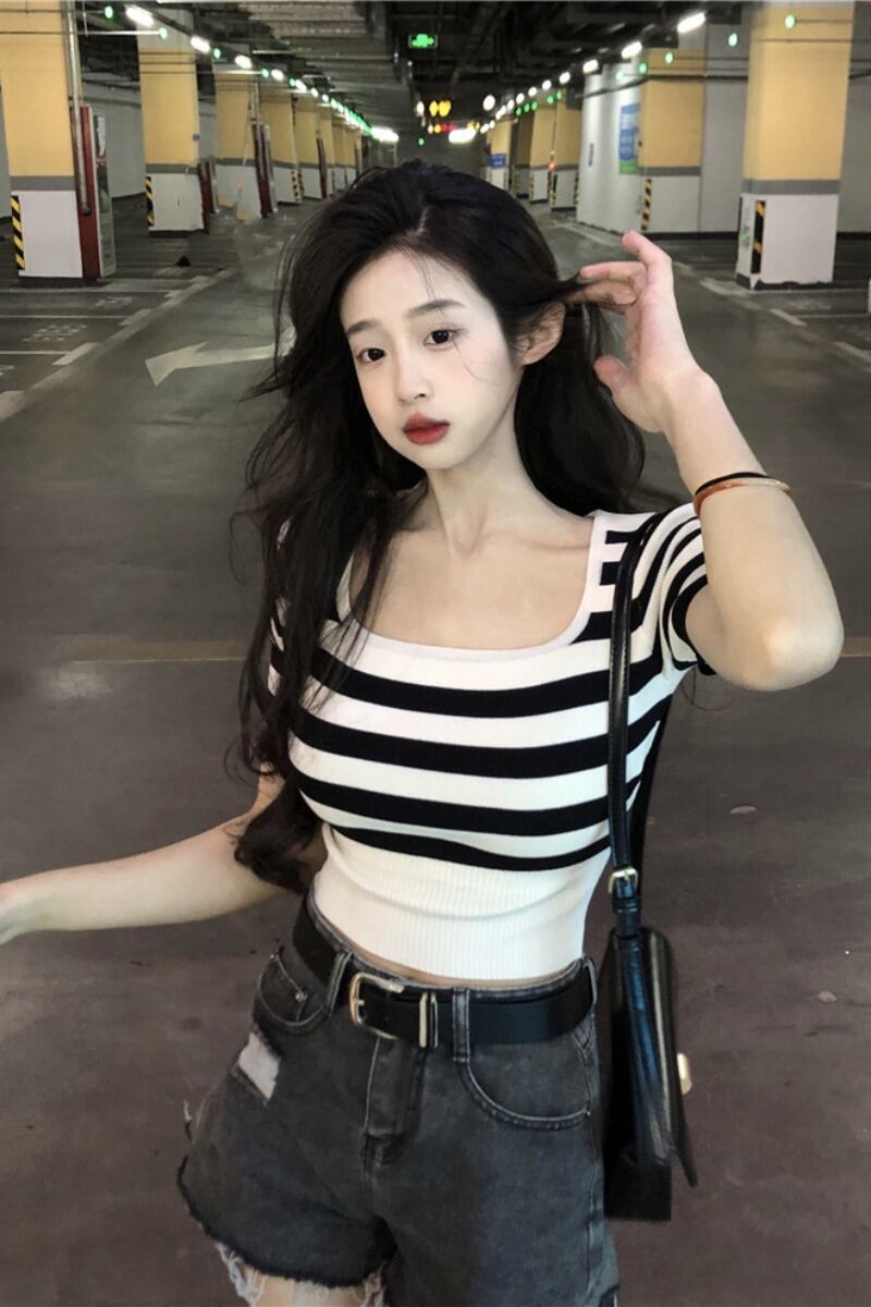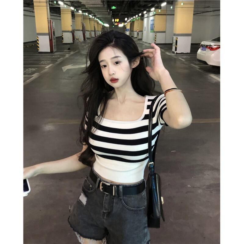 気質スクエアカラーストライプ半袖ニットTシャツレディース2023年夏新作オールマッチスリムフィットと薄手のショートトップ サマー 夏物 スクウェア 0921995809358285