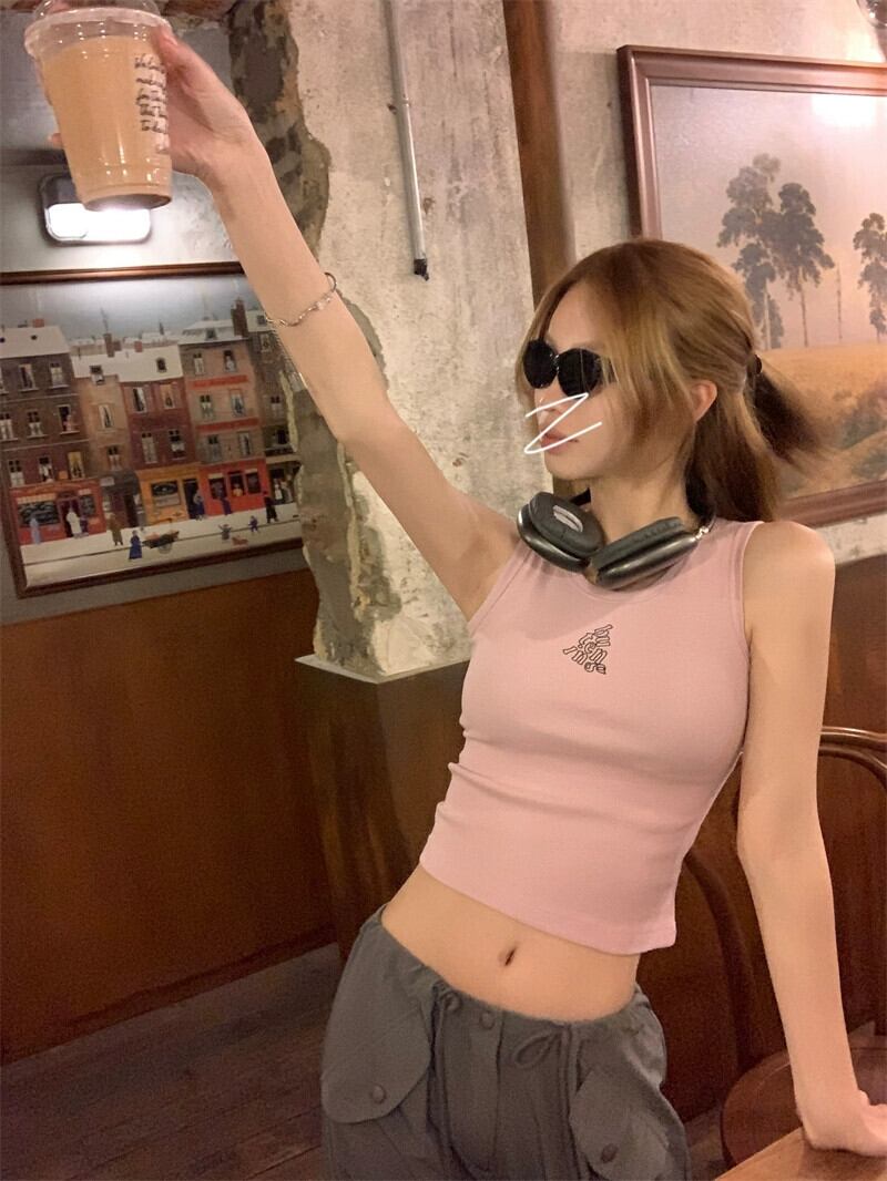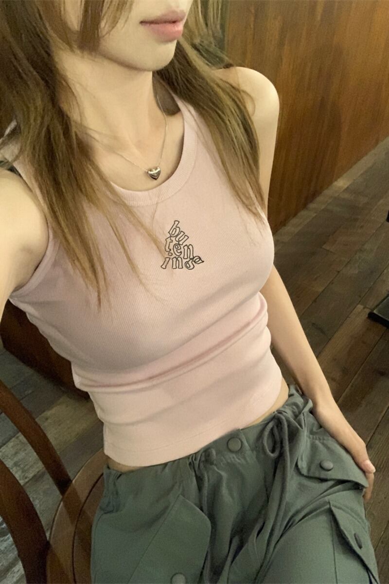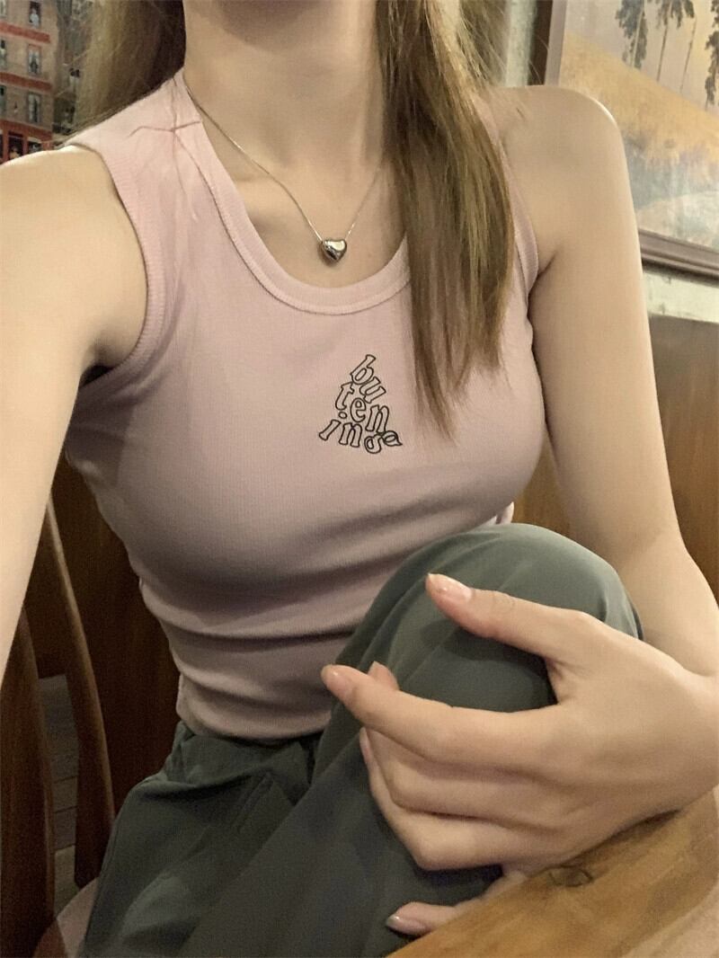 甘辛スタイルのレタープリントキャミソール女性の2023年夏新バージョンスリムで薄いショートノースリーブトップ 半袖 ハーフスリーブ 大人ガーリー スウィート キュート カジュアル サマー 夏物 0921943197650635