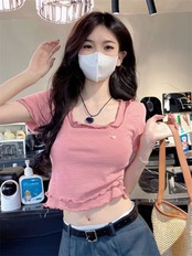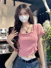 ホットウッドイヤーサイドラブ半袖Tシャツレディース2023年夏新作オールマッチ気質ショートスリムフィットと薄いトップ サマー 夏物 0921949913883473