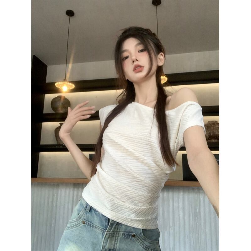 フランスの気質オフショルダー半袖Tシャツレディース2023年夏新デザインセンスニッチシワウエスト痩身トップ サマー 夏物 092193375424568