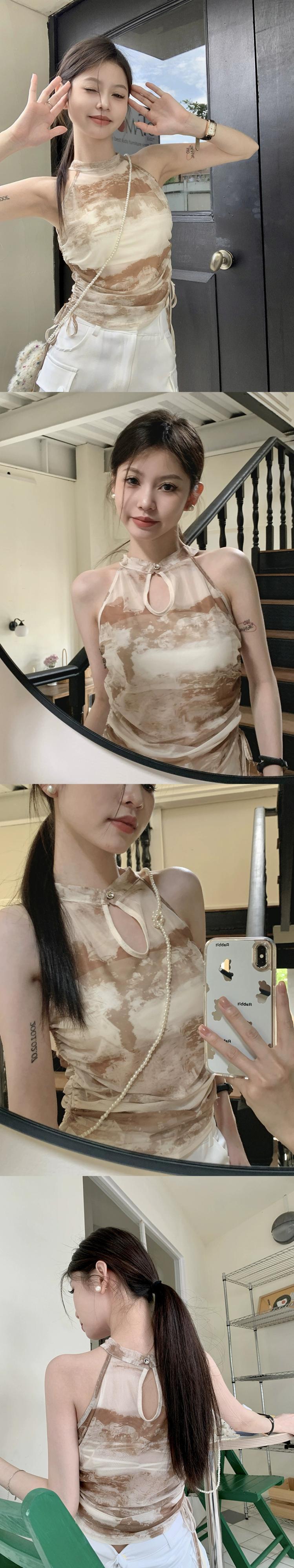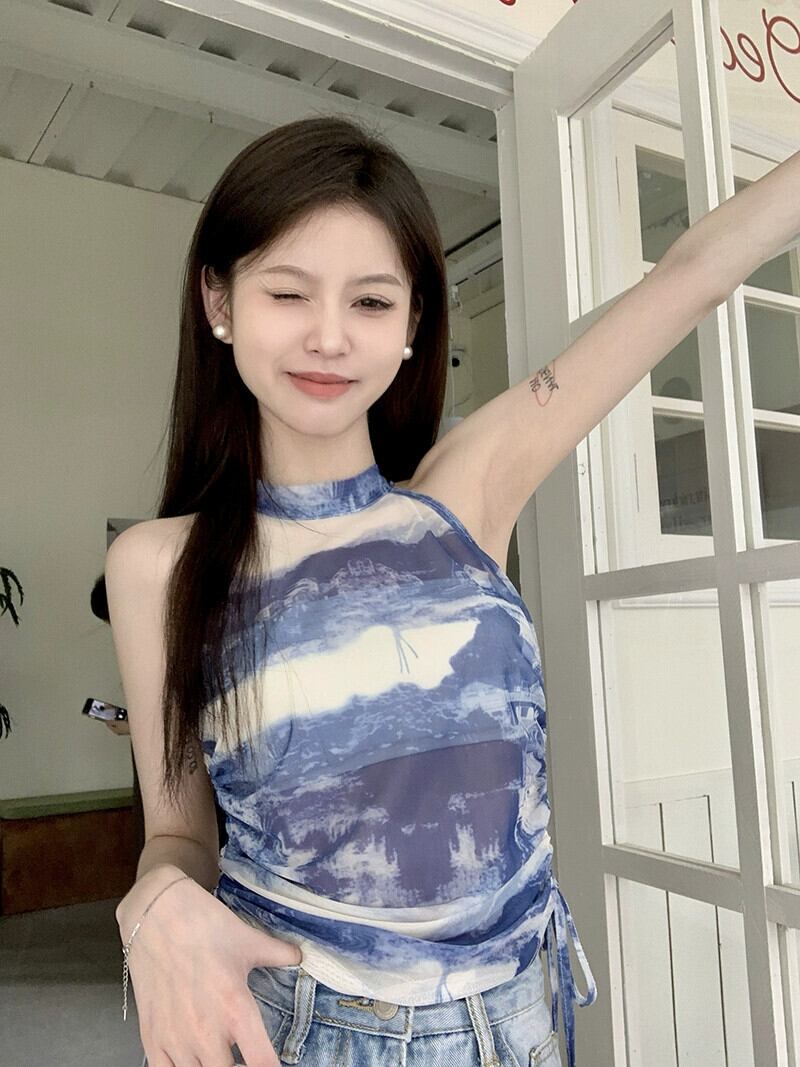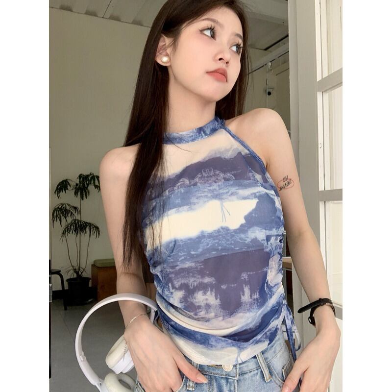 センスタイダイ巾着ハイウエストベストスリングレディース夏ニッチスリム不規則なショートノースリーブトップ ハイウェスト 半袖 ハーフスリーブ サマー 夏物 0921941585711327