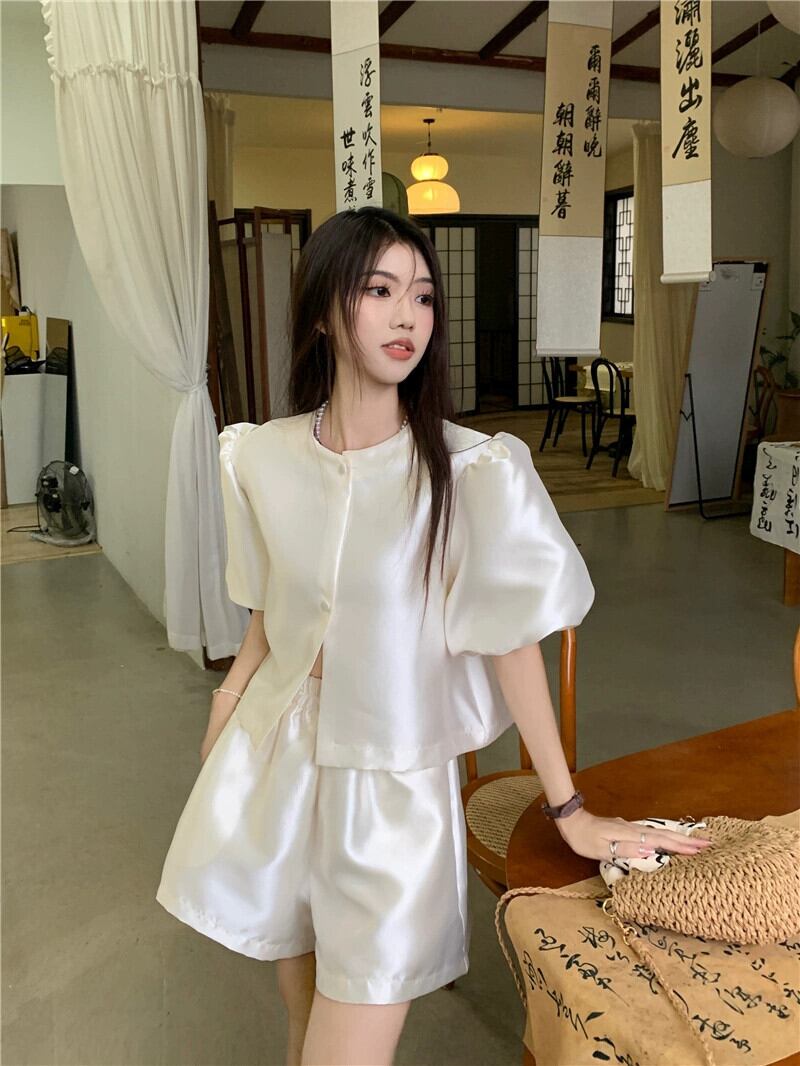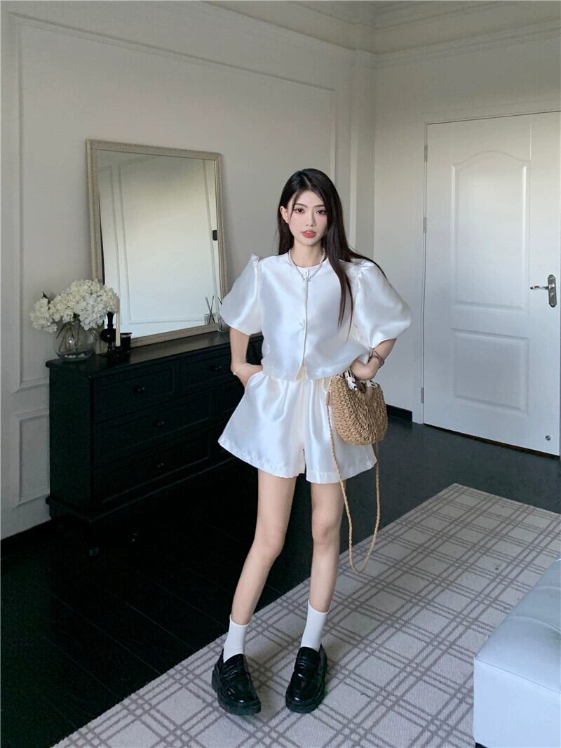 フランスのファッションスーツ女性の夏 2023 新しいパフスリーブシャツトップハイウエスト薄いショーツツーピーストレンディ ハイウェスト サマー 夏物 ブルマー 0921911584595223