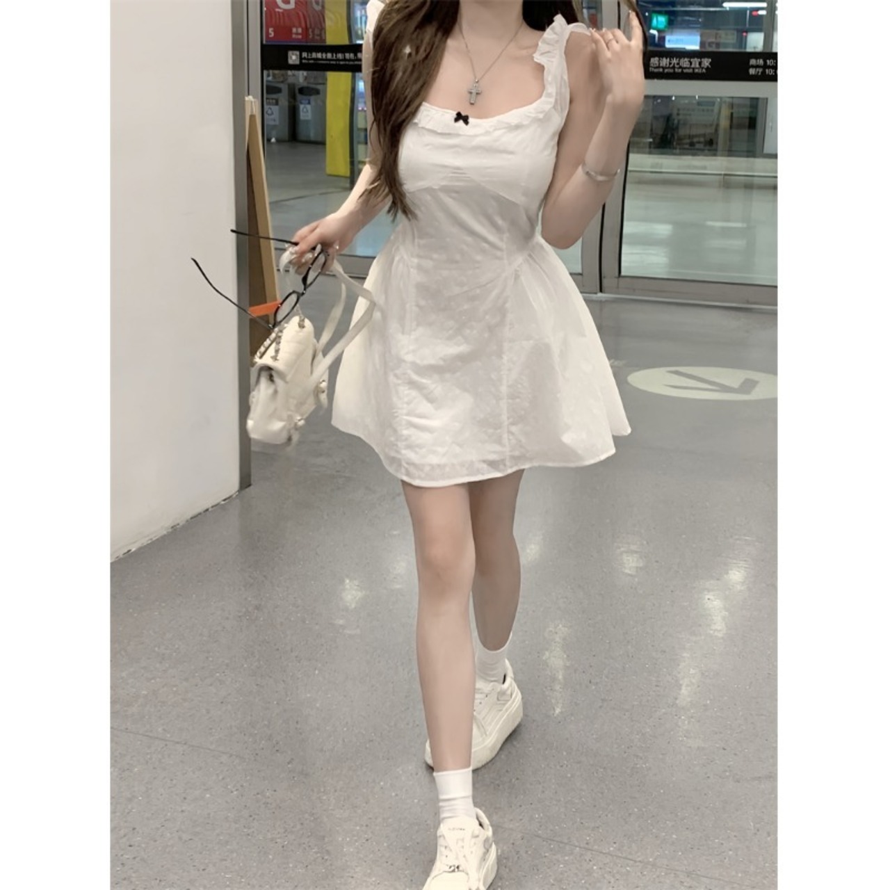 ガーリッシュホワイト小さなフライングスリーブドレスの女性の夏の2023新しい気質スリムウエストと薄いアウターショートスカート サマー 夏物 0921982309913857
