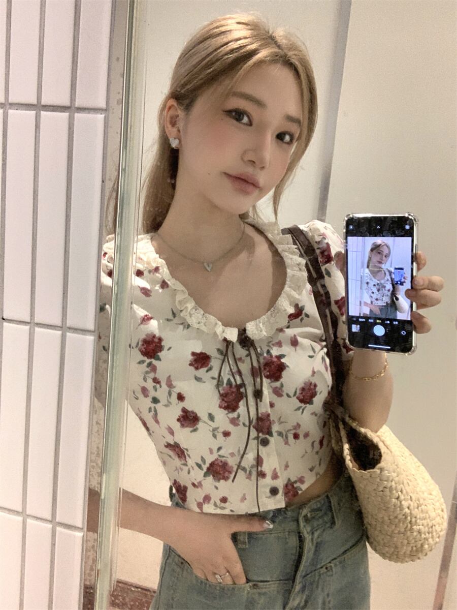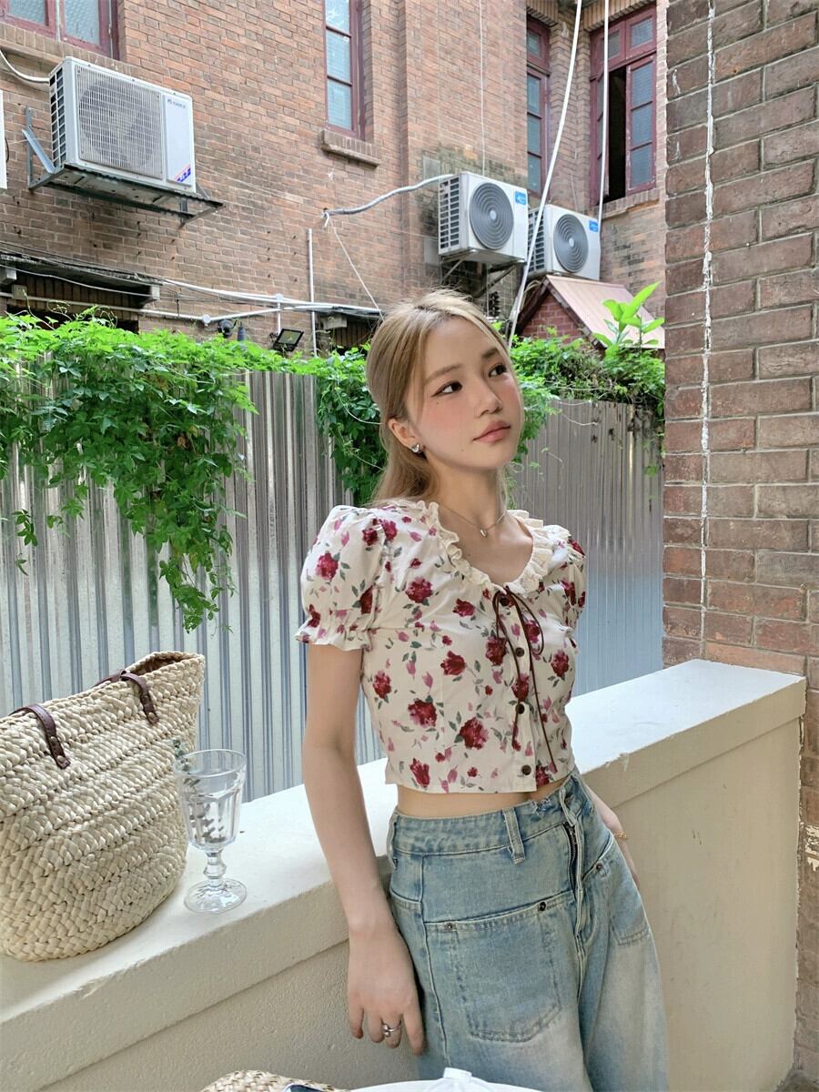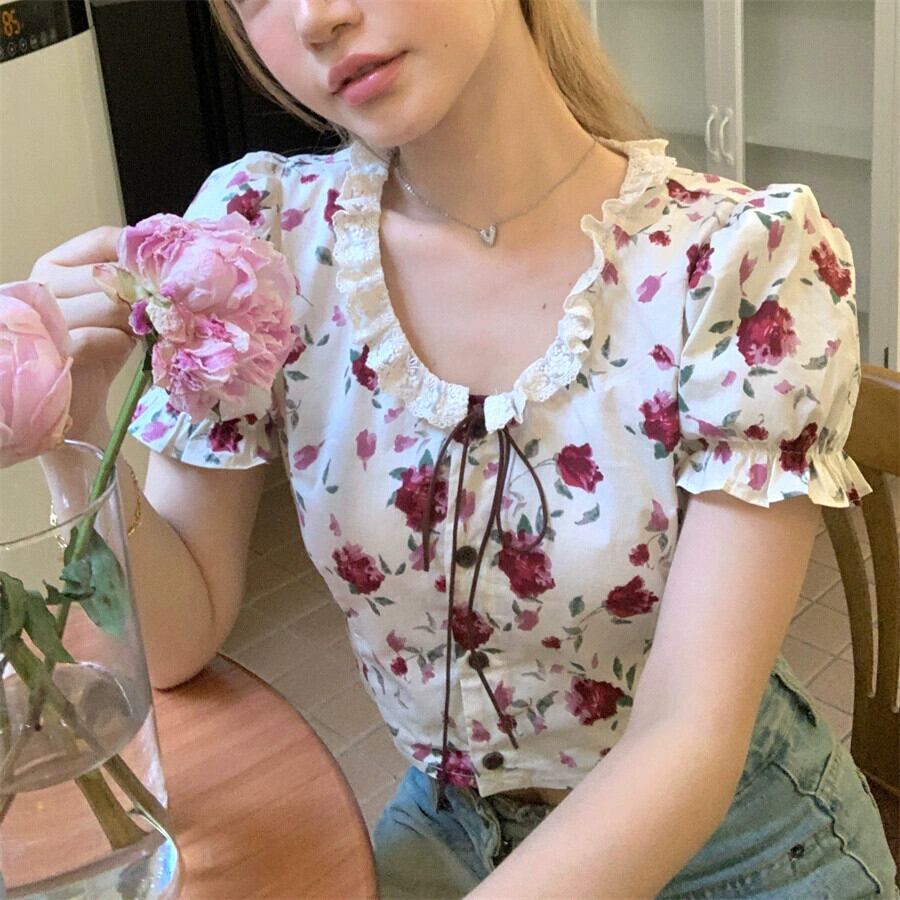 フレンチローズプリントレースアップ半袖シャツレディース夏デザインセンスニッチ木耳サイドスリムフィットショートトップ サマー 夏物 0921968511037926
