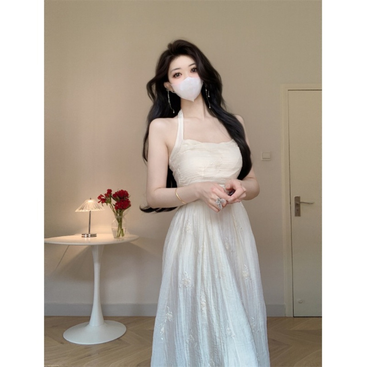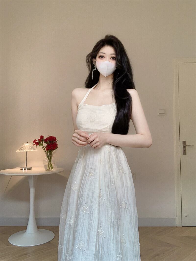 初愛優しい風ホルターネック刺繍ドレスの女性の夏 2023 フランスの気質折りウエスト A ラインスカート レッド サマー 夏物 Aライン 0921980032667510