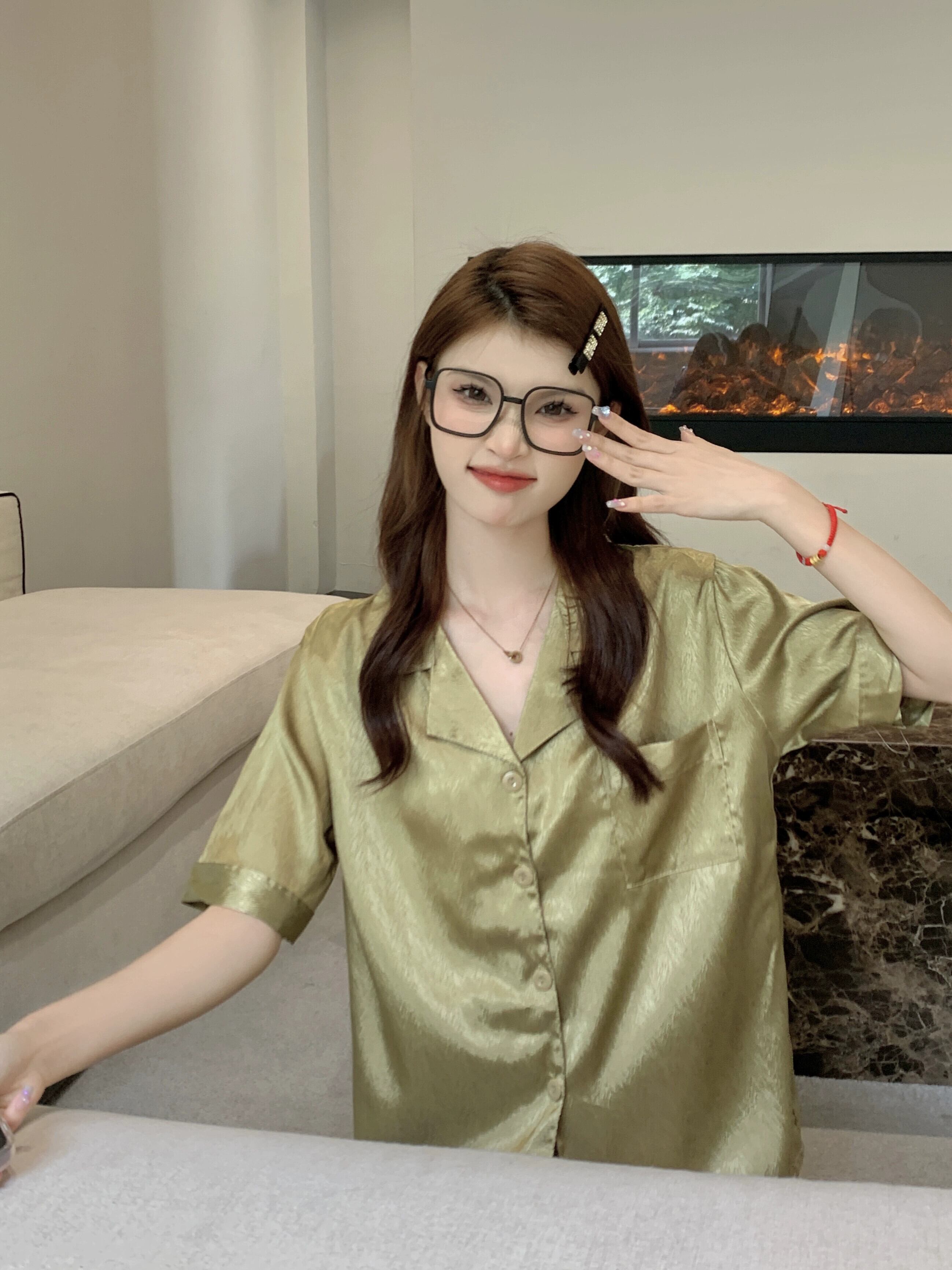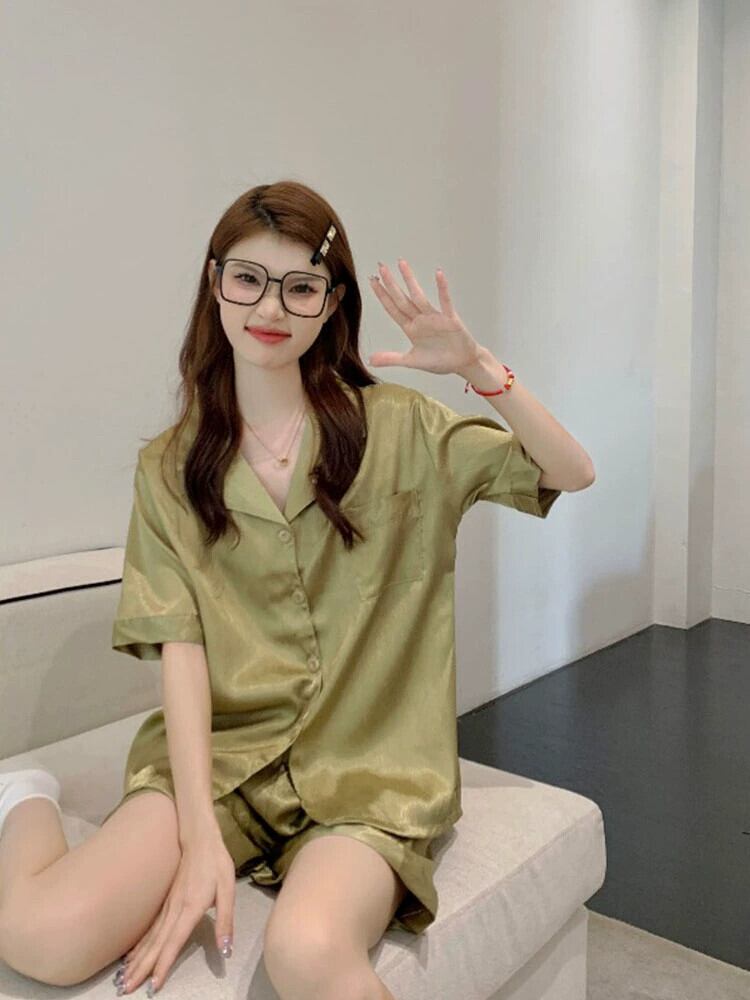 -end アイスシルク パジャマ セット レディース 2023 年夏新作 ルーズ カーディガン 半袖 ショーツ ホームサービス 2点セット サマー 夏物 ブルマー 0921981257569419